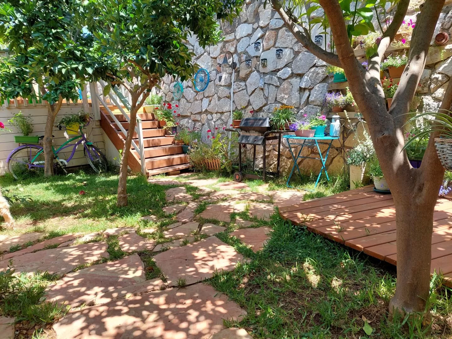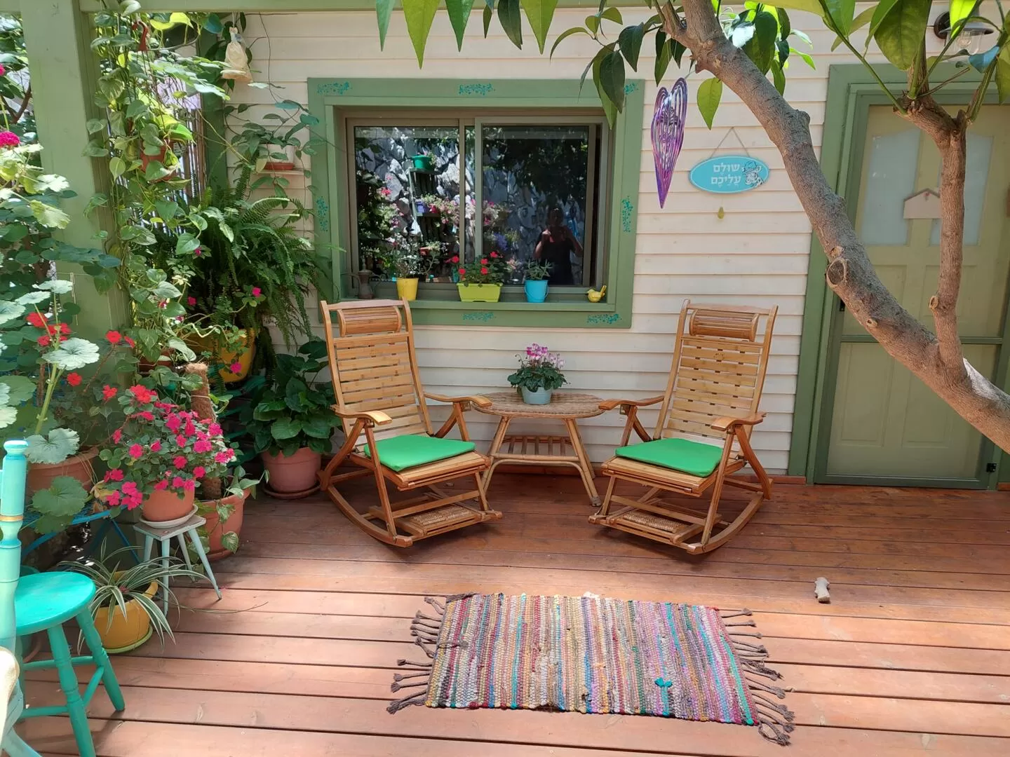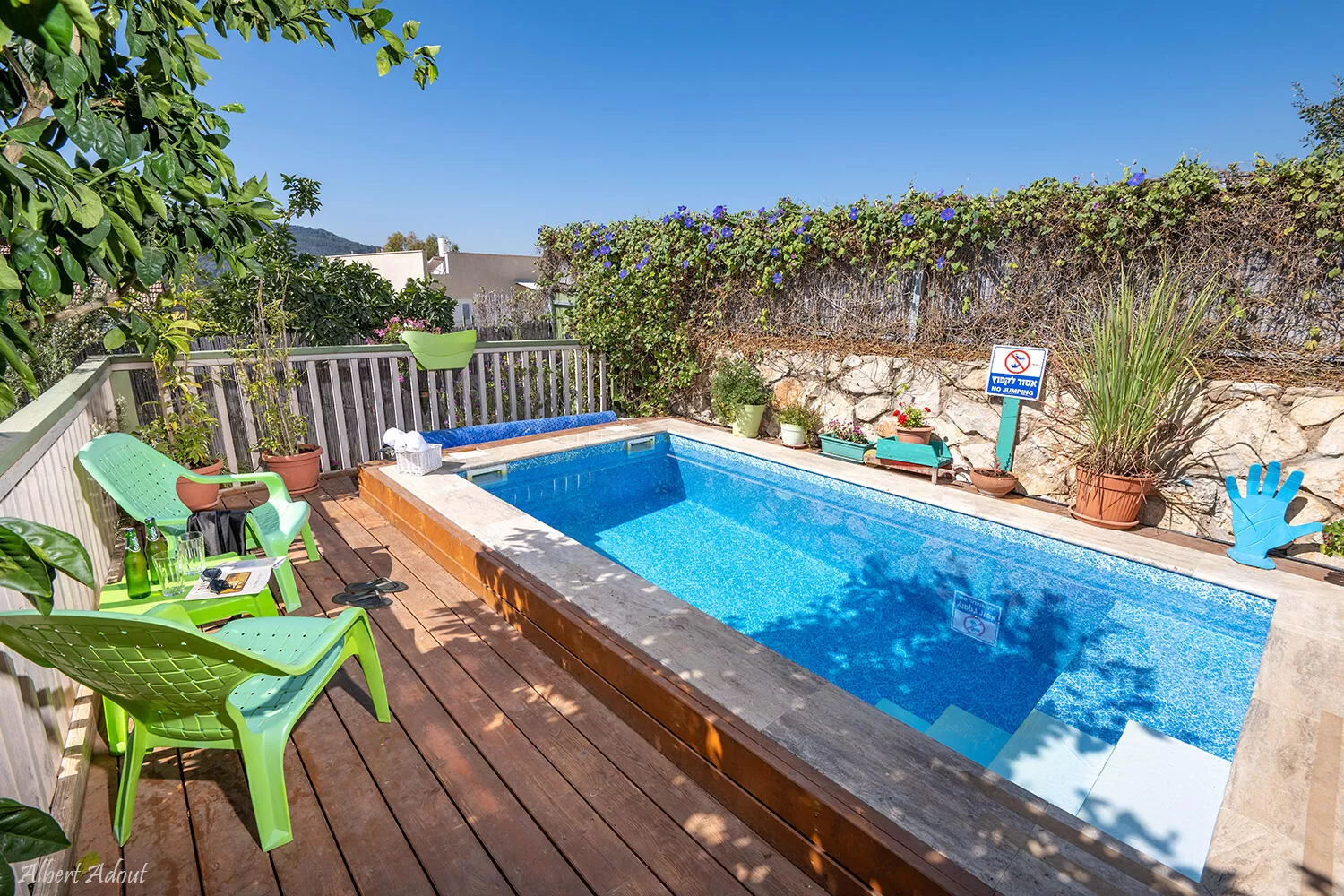 החצר מוקפת צמחייה מטופחת בשיא פריחתה, גדר אבן שמקיפה אותה מפרידה אותה מן החוץ, והבריכה הבנויה נעימה ומשתלבת ברצפת דק. לצד הבריכה תמצאו כיסאות נדנדה של פעם והרבה קישוטים בעבודת יד שמצויים בכל פינה, בחוץ ובפנים צימר העץ, החמים והקוסם בפשטותו.
