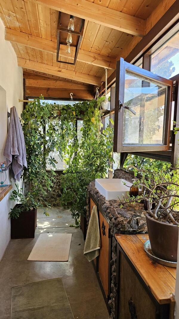 כשתרצו לבשל תוכלו ליהנות ממטבח מאובזר עם אי נוח במרכזו. חדר הרחצה כאן הוא אחד המיוחדים שראינו, מוקף בחלונות זכוכית ומלא בצמחיה. בקירות ובשידת הכיור משולבות אבנים טבעיות, והוא מלא בתשומת לב ויצירתיות.