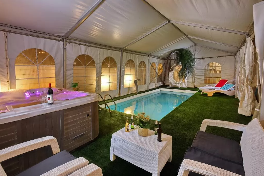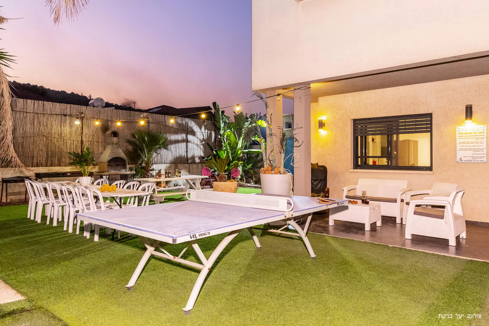 נוסף לחדרי השינה המקום כולל גם חללים גדולים ונעימים לבילוי בקבוצה. הגינה בכניסה למתחם מאובזרת בפינות ישיבה, ערסלים ופינת מנגל, כשבצמוד אליה נמצא מתחם הבריכה המקורה, הכולל גם ג'קוזי ספא גדול ומפנק. הבריכה מחוממת לאורך כל השנה לטמפרטורה של 30 מעלות, בעוד הקירוי מאפשר לבלות בה בכל מזג אוויר.