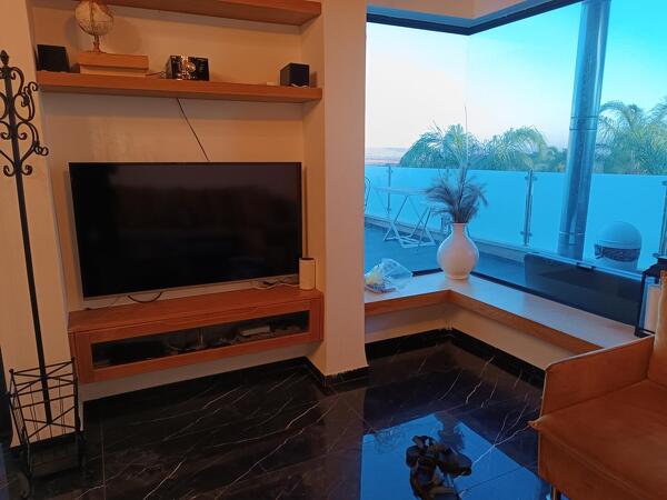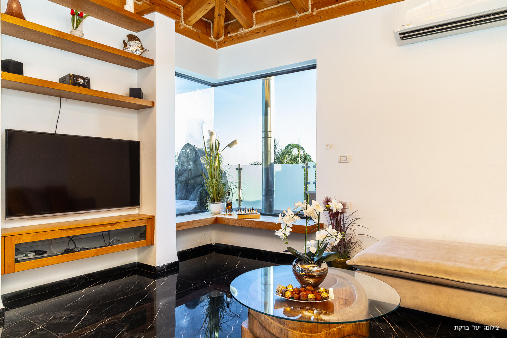 כשנכנסים לתוך היחידה מגלים סלון עם פינת ישיבה רחבת ידיים, אל מול טלוויזיה ענקית חכמה, ולצידה חלון פנורמי גדול פונה אל המרפסת והנוף. עוד ביחידה פינת אוכל ומטבח מאובזר.