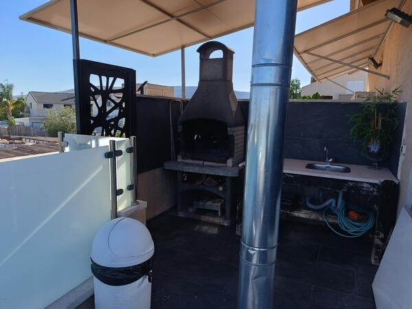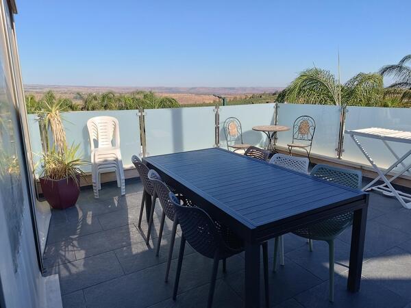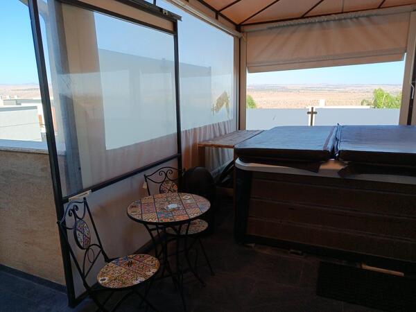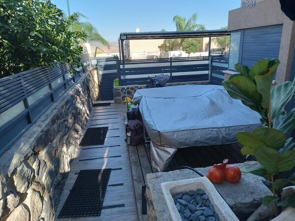 דלת הזזה נוחה מובילה למרפסת ענקית שהיא חצי מקורה וחצי פתוחה, ובה ג'קוזי ספא ענק המתאים לשמונה אורחים וצופה לנוף מרהיב, מיטות שיזוף, ערסלים, ופינת מנגל מרווחת ומסודרת עם כיור חיצוני.