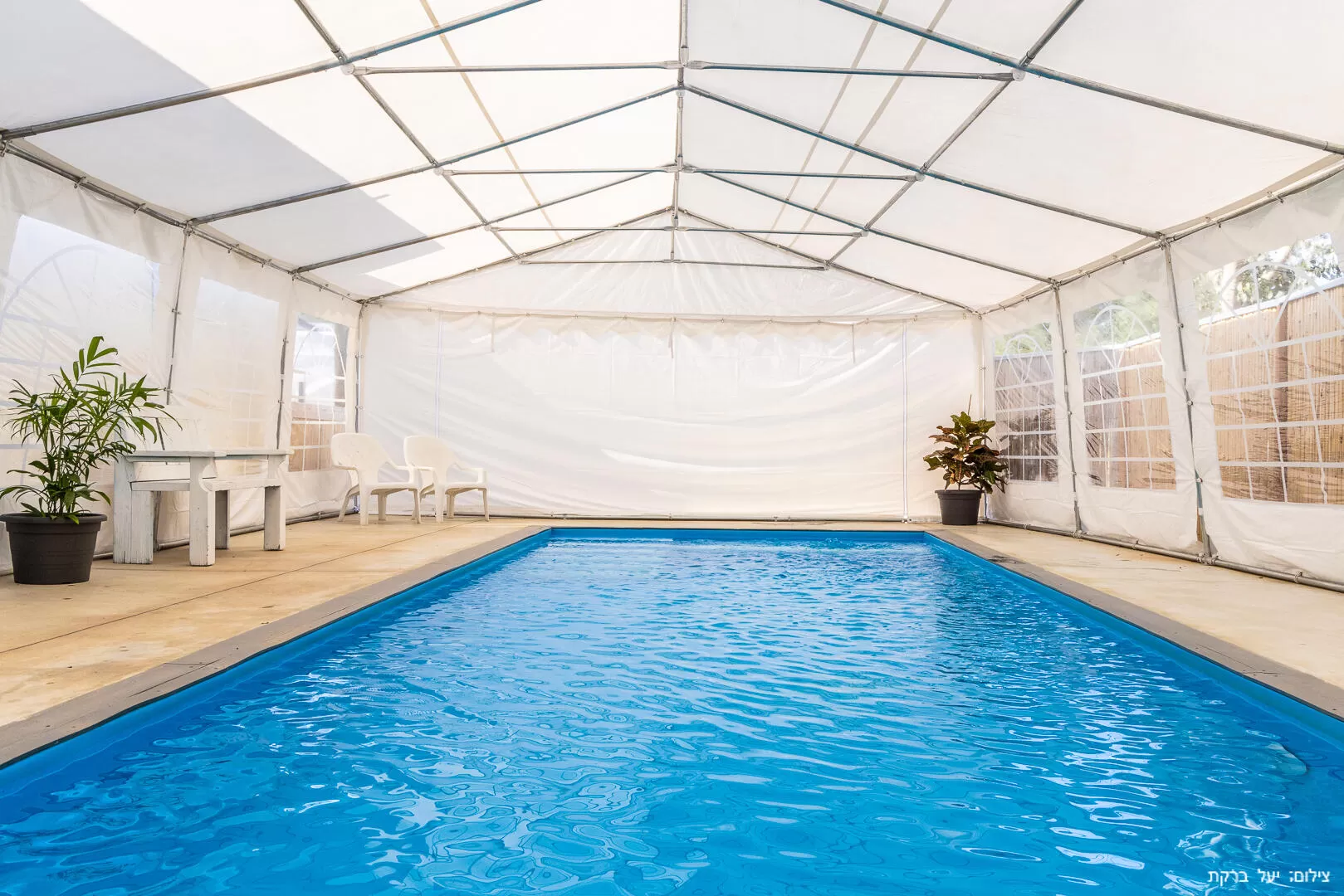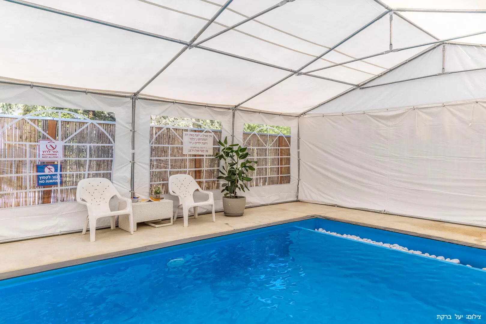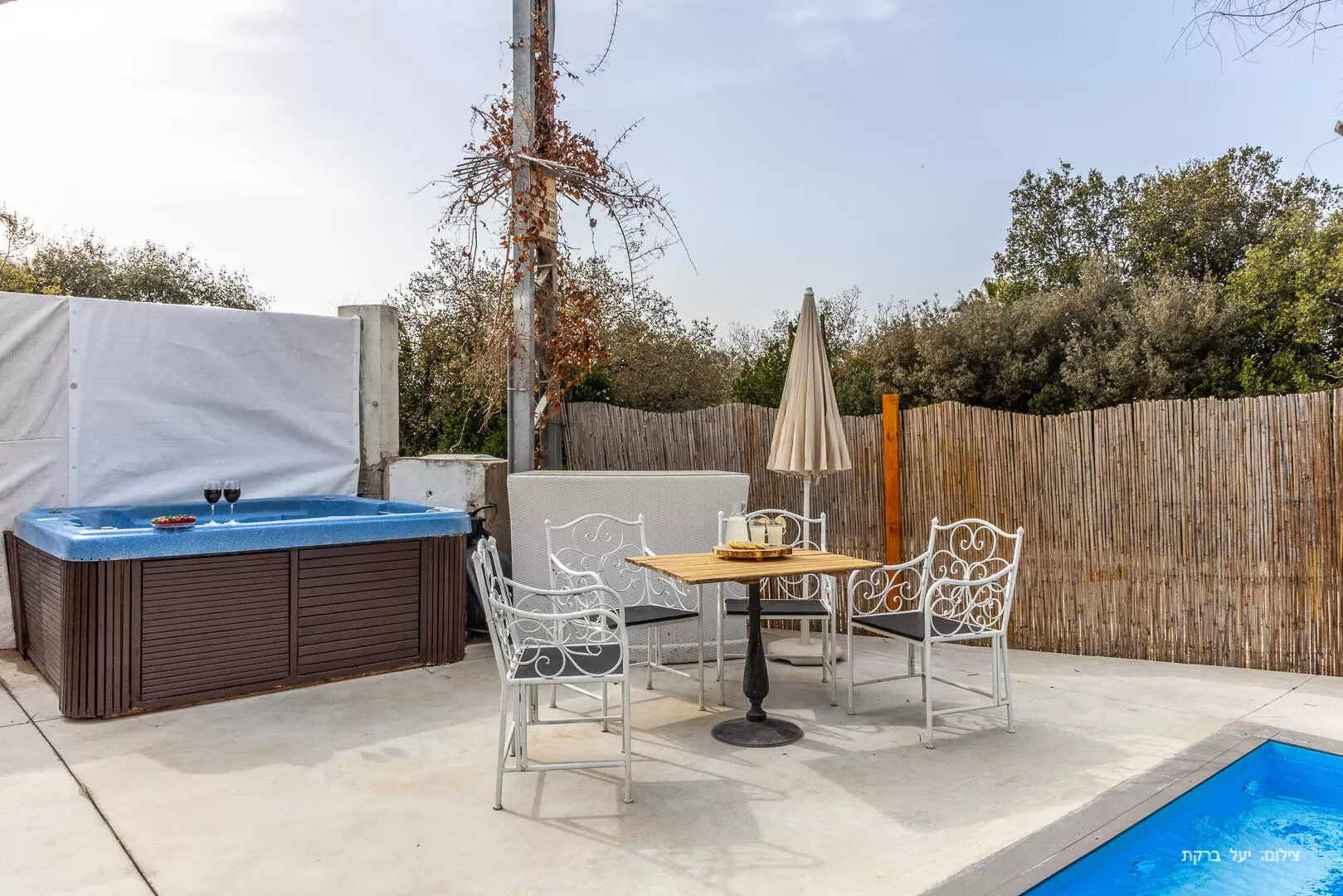 במתחם החוץ תמצאו בריכה בנויה גדולה ומחוממת, עם ספסל זרמים מפנק. לצד הבריכה ניצב ג'קוזי ספא ופינת ישיבה אינטימית. לא רחוק מהבריכה נמצא אזור המרפסת המקורה עם שולחן אוכל, פינת ברביקיו, ואזור משחק לילדים עם שולחן פינג פונג וטרמפולינה.