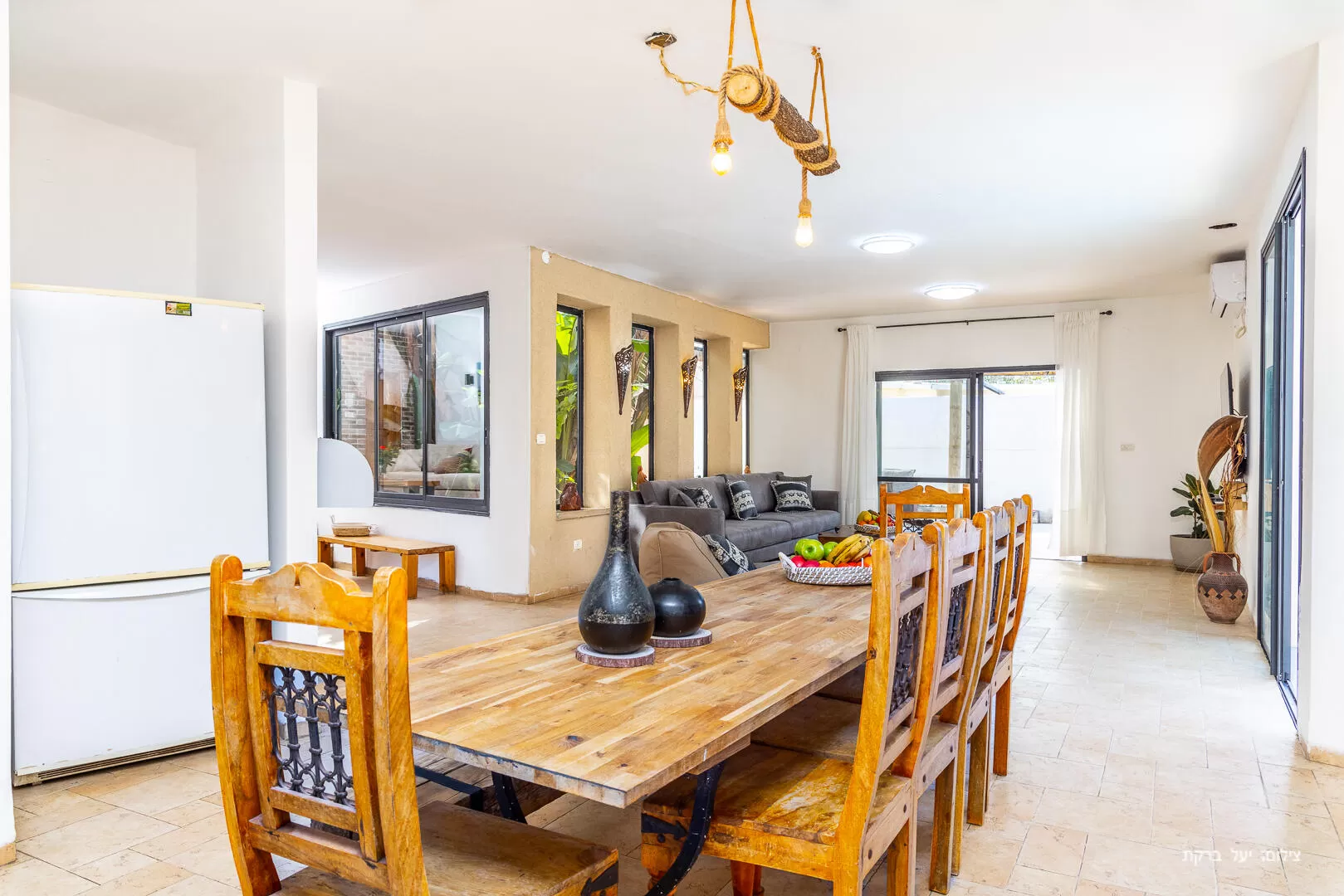 מהחלל המרכזי יש דלת הזזה גדולה ושקופה, המשקיפה לאזור הבריכה והג'קוזי, ומאפשרת גישה ישירה לאזור הבריכה. בסלון תמצאו ספה רחבה וטלוויזיה גדולה, וממנו יציאה למרפסת מקורה עם משחקים לילדים ופינת אוכל נוספת. לא רחוק מהסלון, נמצא חדר טלויזיה פתוח, ובו תקרה מעוגלת ייחודית עם פתחים עגולים משובצים זכוכית, דרכם חודר אור טבעי נעים. אהיל בסגנון מרוקאי תלוי במרכז התקרה העגולה ומוסיף לאווירה. באזור זה יש ספה רחבה, טלוויזיה, וקמין עץ לשימוש בחורף.