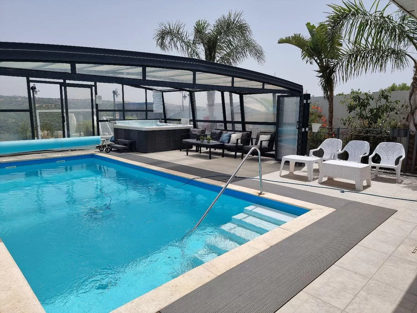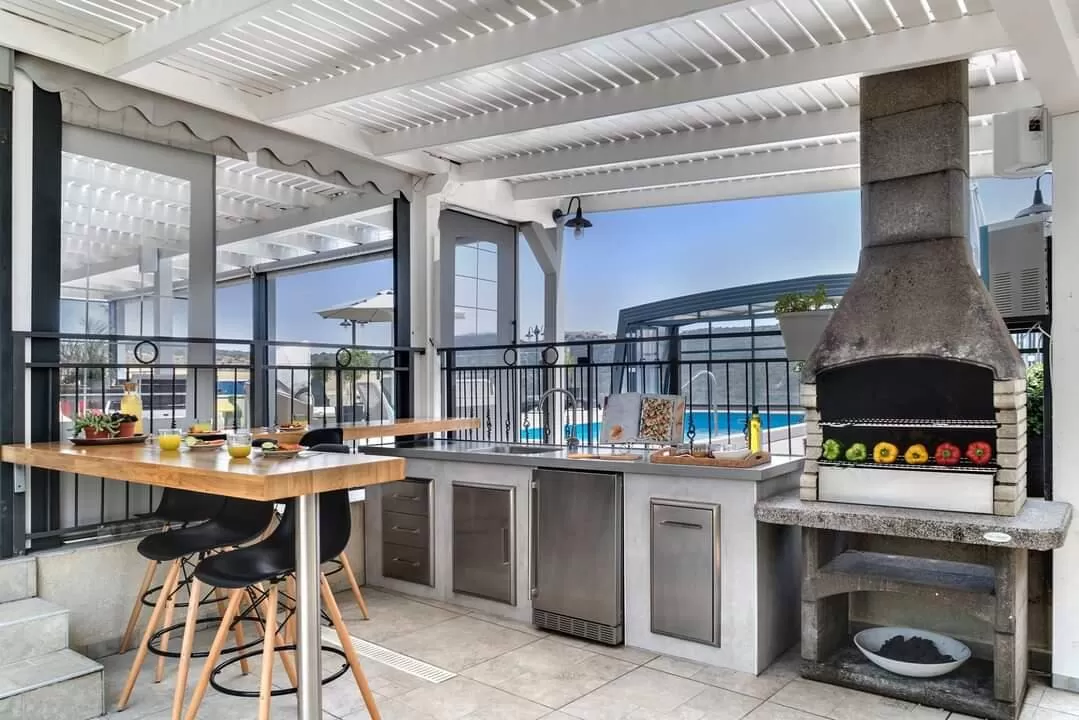 הילדים יהנו כאן ממשחקייה מוצלת, והמבוגרים יוכלו להתפנק מול הנוף על נדנדה, או מיטת רביצה מקורה. מרפסת סגורה וממוזגת מחכה לכם גם היא במתחם החוץ, ובה מטבח מאובזר שכולל בין היתר מכונת קרח וברד (כבר אמרנו שהילדים יהנו פה?) עמדת ברביקיו פחמים נוחה, ופינת אוכל גדולה ומרווחת. אבל הכיף ממש לא נגמר כאן - במרפסת הממוזגת מוקפת החלונות יש עוד הרבה מה לעשות: החל מפינות ישיבה וטלוויזיה גדולה, עד משחקי שולחן לאוהבי הז'אנר: הוקי שולחן, כדורגל שולחן, ושולחן סנוקר.