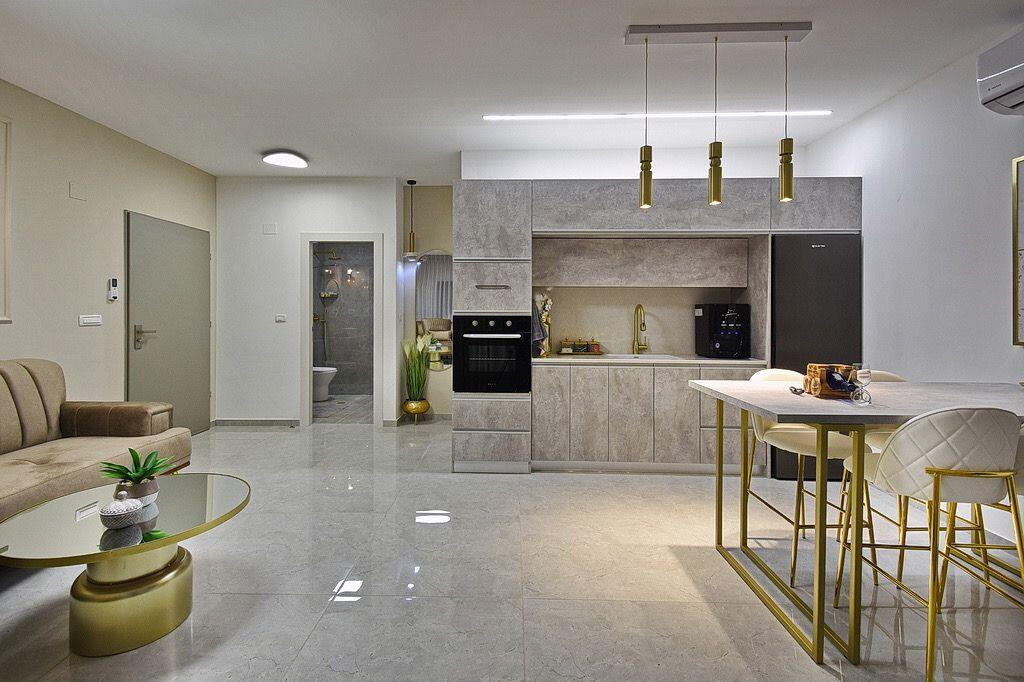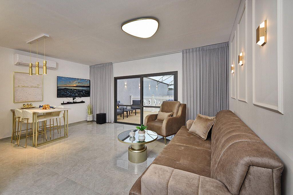 הסוויטה מתאימה לזוגות עם עד 3 ילדים, וכוללת חדר שינה אחד לצד חלל בילוי מרווח. הסלון מזמין לישיבה נוחה מול טלוויזיה גדולה והמטבח חדיש ומעוצב, מאובזר לבישול מלא, וכולל פינת אוכל ל-4 סועדים. בעיצוב המקום הושקעה מחשבה מעמיקה, כשלצד הריהוט המעוצב תמצאו גם גופי תאורה יוקרתיים. חדר הרחצה מרווח ונעים, מעוצב בשיש וזכוכית עם ברזים מוזהבים.