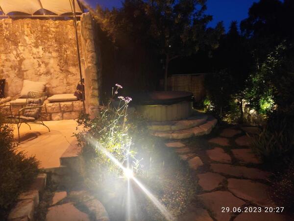במתחם החוץ המטופח יש שולחן אוכל גדול ומוצל, עם עמדת ברביקיו גז לצידו. אזורי ישיבה מגוונים פזורים בגינה, ושבילים מתפתלים בתוך גינת התבלינים הפורחת. גולת הכותרת של החצר היא ההוט-טאב המפנק שמתאים ל-6 רוחצים.