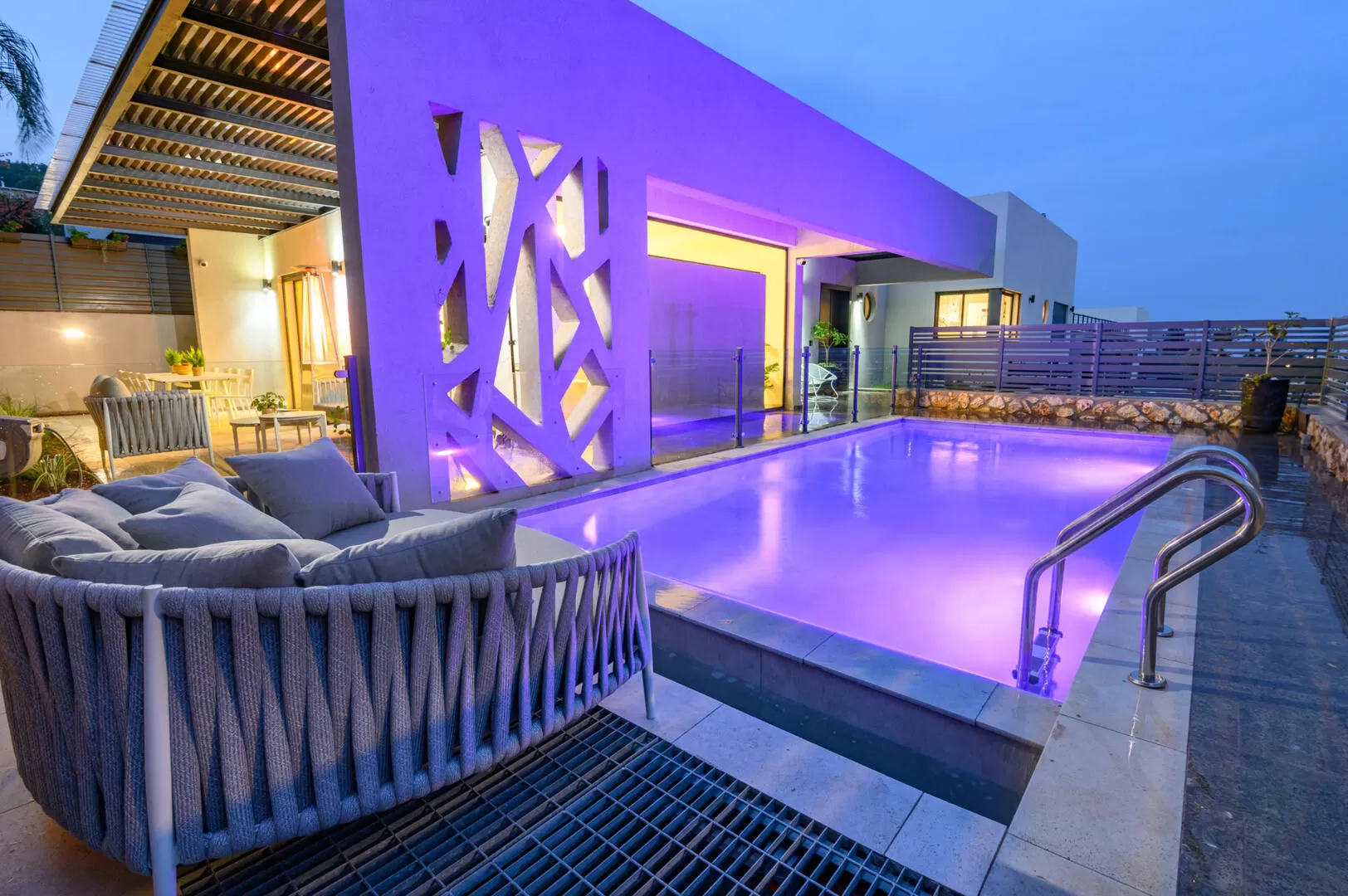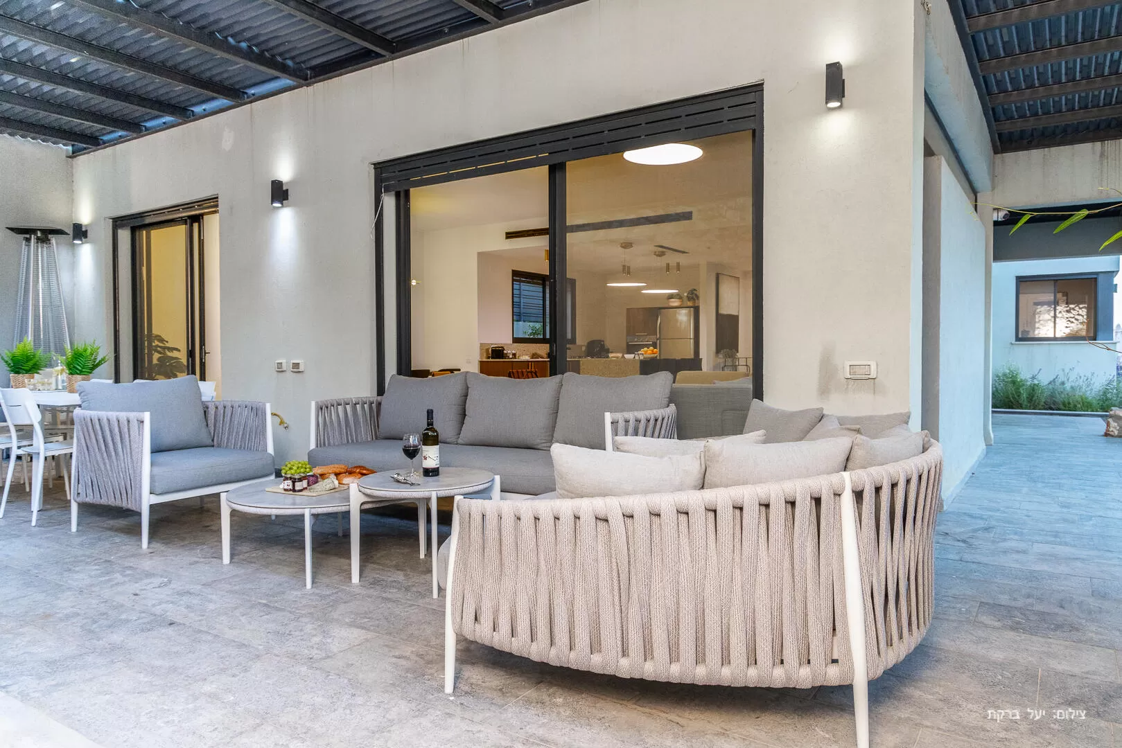 מתחם החוץ כולל בריכה מחוממת (ומקורה בחורף) פינת ישיבה אלגנטית ונוחה, שולחן אוכל גדול, ועמדת ברביקיו איכותית.