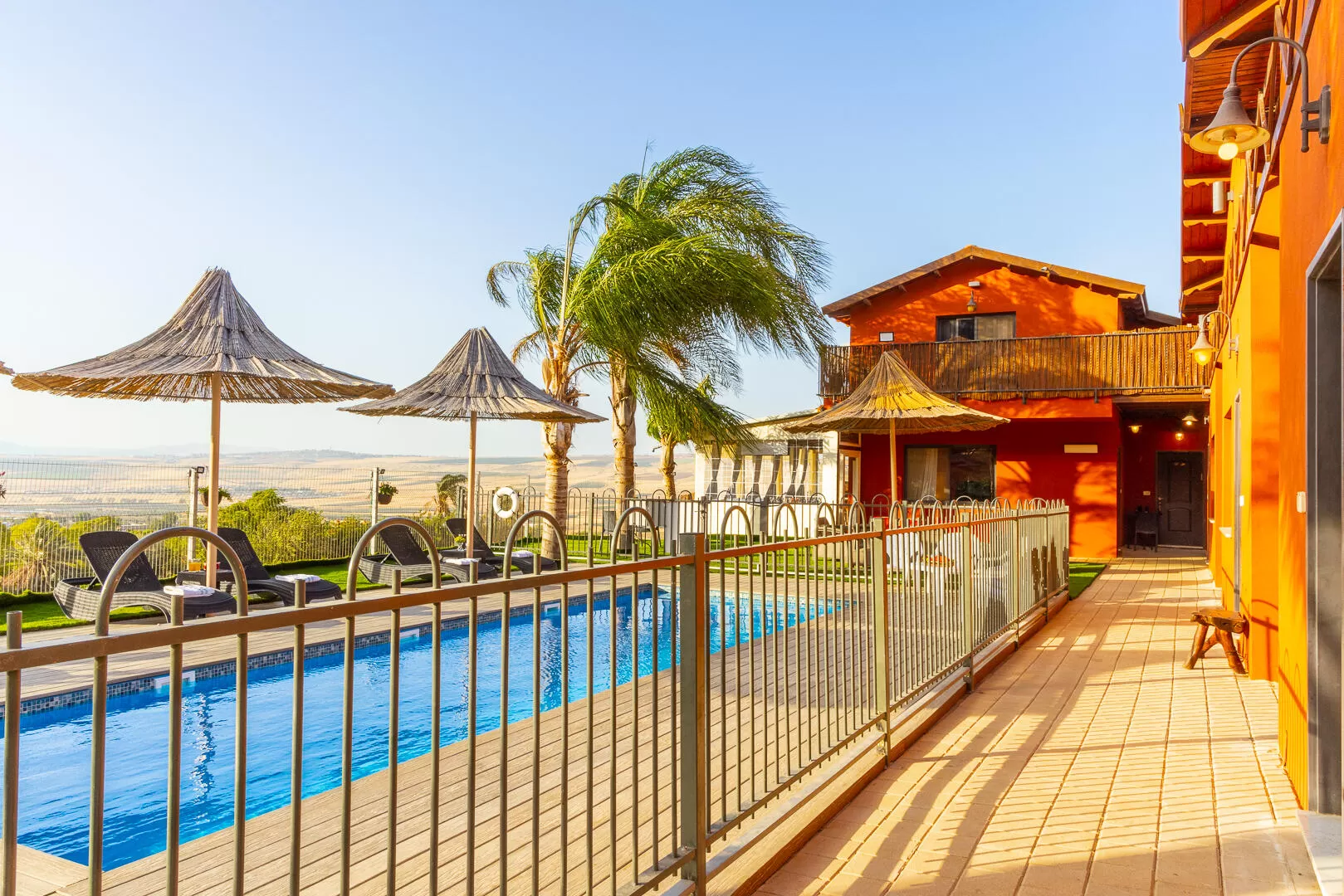 הבריכה במתחם גדולה, מרעננת ומזמינה, ומחוממת בעונת הסתו והחורף (בדר"כ מנובמבר עד אפריל). כמו כן היא בעלת גידור בטיחות לילדים. הבריכה כמו הג'קוזי צופים לנוף, ממנו תוכלו ליהנות גם כשתנוחו על מיטות השיזוף שמוצבות תחת שמשיות קש אפריקאיות.