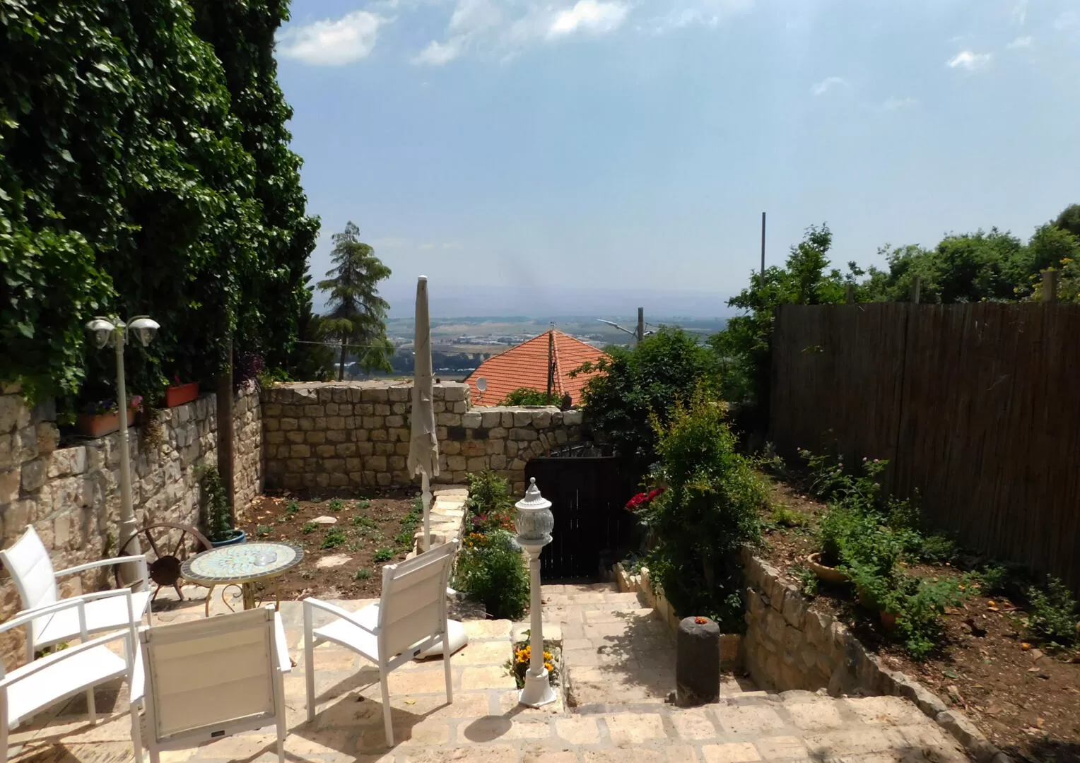 בחצר תהנו מגינה פורחת, מדשאה אינטימית מתוקה, ופינת ישיבה שצופה לרמת הגולן ולהר בנטל.