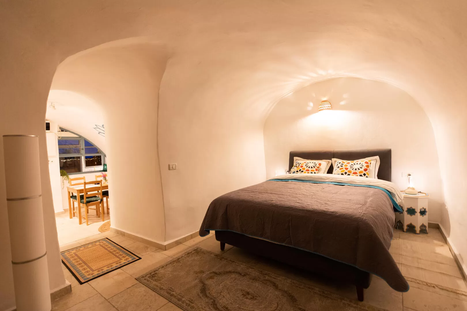 הסוויטה מחולקת לכמה חללים עם זרימה טובה ביניהם, והיא מתאימה לעד 4 מבוגרים, או לשני מבוגרים ושני ילדים. חדר השינה נמצא בחלק הפנימי והיותר "מערתי" של הסוויטה, והאווירה בו אינטימית ונעימה - המיטה הזוגית מוצעת במצעים יפים ורקומים, והתקרה מעל מקומרת לקשת גדולה. שידות בסגנון מרוקאי לצד המיטה, מנורות יפות, וארון שמתקמר עם הקיר משלימים את הקונספט העיצובי האותנטי של המקום. חדר הרחצה של הסוויטה מואר ומקסים בעיצובו, עם רצפה מעוטרת וראש גשם מפנק במקלחת. קישוטי קיר יפים, פריטי נוי ועציצים עם צמחיה טבעית מקשטים את החלל כולו, ומשרים תחושה ביתית נינוחה.