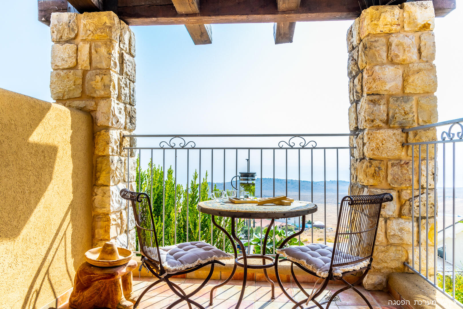 מתחם החוץ של המלון שוקק חיים וטבע גלילי: עצי זית, גינות פורחות ומלאות בצמחי תבלין ובריח לבנדר וגפנים שמטפסים על קירות האבן מכניסים אותנו לאווירה ים תיכונית. חמש הסוויטות חולקות בריכה מרעננת (מחוממת ומקורה בחורף) עם פינות שיזוף על דשא (סינטטי), פינת ישיבה, ושמשיה.