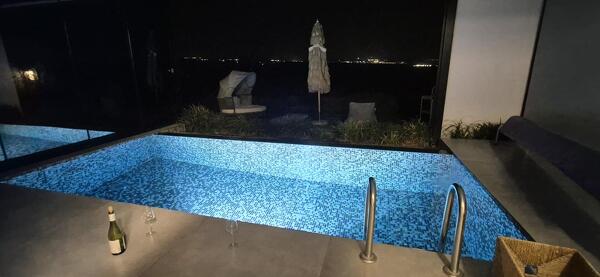 מתחם החוץ נמצא במרחק של צעד אחד החוצה למרפסת, ובו מחכה לכם בריכת אינפיניטי יפהפיה ומקורה, בנויה מפסיפס ובעומק 1.60. אם תרצו ליהנות מפרטיות מלאה, תוכלו פשוט לסגור את תריס הגלילה החשמלי ששומר על האור הטבעי, ומאפשר לכם להמשיך ליהנות מהנוף מבלי שיוכלו לראות אתכם מבחוץ. כשתרצו לגוון מלצפות בנוף, תוכלו להנות ממקרן חיצוני שמאפשר לכם לצפות על מסך בגודל 100 אינץ', ממש מול הבריכה.