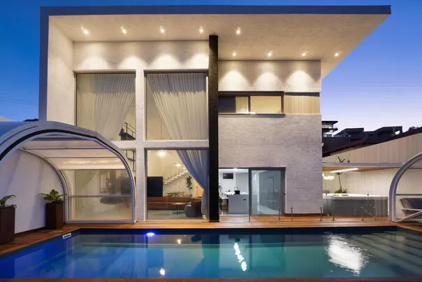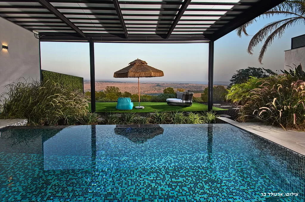 מתחם החוץ נמצא במרחק של צעד אחד החוצה למרפסת, ובו מחכה לכם בריכת אינפיניטי יפהפיה ומקורה, בנויה מפסיפס ובעומק 1.60. אם תרצו ליהנות מפרטיות מלאה, תוכלו פשוט לסגור את תריס הגלילה החשמלי ששומר על האור הטבעי, ומאפשר לכם להמשיך ליהנות מהנוף מבלי שיוכלו לראות אתכם מבחוץ. כשתרצו לגוון מלצפות בנוף, תוכלו להנות ממקרן חיצוני שמאפשר לכם לצפות על מסך בגודל 100 אינץ', ממש מול הבריכה.