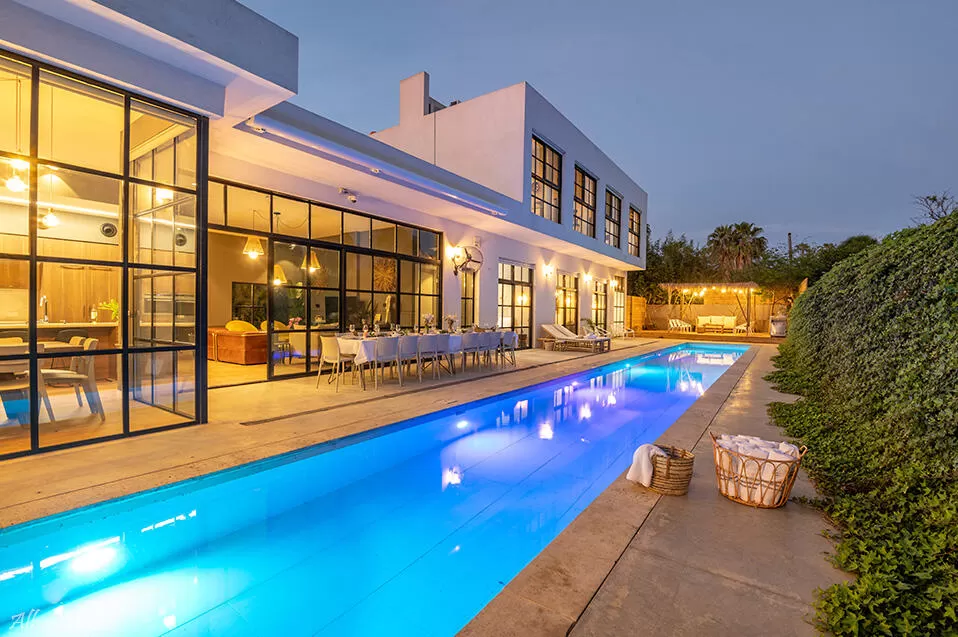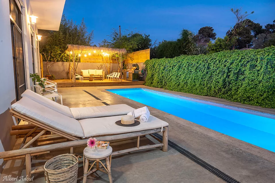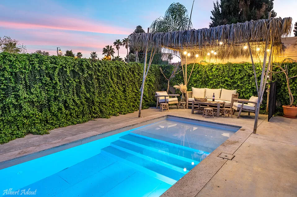 העיצוב המוקפד לא פסח כאן גם על מתחם החוץ היפה והיוקרתי: בריכה סופר ארוכה (25 מטרים אורך!) שמגיעה בהדרגתיות לעומק של 170 ס"מ מאפשרת לכם "לעשות בריכות" בשחייה נוחה. אי אפשר לפספס את הגדר הארוכה והירוקה שלצד הבריכה, שעליה צמחיה ירוקה שבולטת לצד הגוון הכחול של המים, ומקנה גם מראה מרהיב וגם פרטיות מלאה. עוד ממתינים לכם כאן - מטבח חוץ מפנק עם עמדת ברביקיו ומקרר בירות צמוד, שולחן פינג-פונג לשחקנים שביניכם, ושולחן ארוך לסעודה חגיגית. לעת ערב תוכלו ליהנות מתאורת חוץ יפהפיה שמשחקת עם השתקפות האור במים, ויוצרת מראה רומנטי ומזמין.