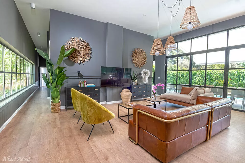 חלל הסלון מרווח עם תקרה גבוהה וחלונות זכוכית ענקיים לאורכו - מה שמכניס אליו המון אור ולא פחות חשוב, מעניק הצצה מדהימה למתחם החוץ המפנק. בסלון יש מערכות ישיבה איכותיות ושיקיות, צמחיה ואהילים מעוצבים שמוסיפים לאווירה, וכמובן טלוויזיה חכמה וגדולה.
