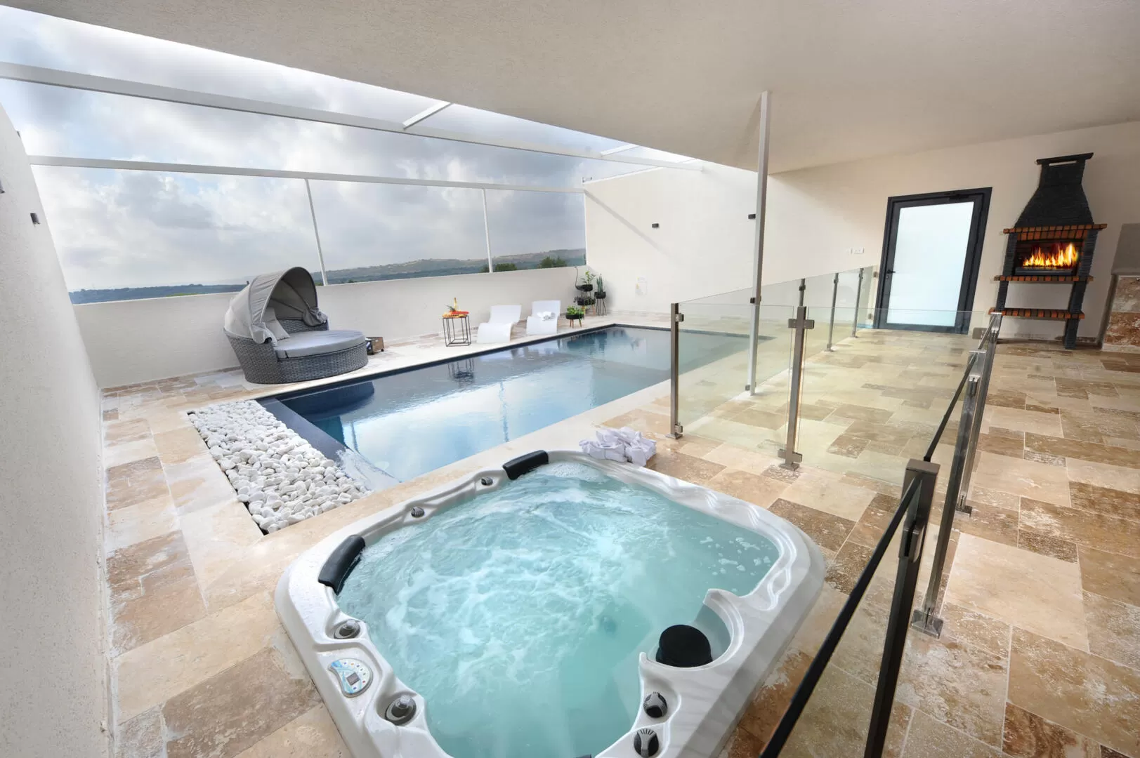 באחוזה יש מטבחון פרקטי שמתאים לבישול קל, אבל אם תרצו לבשל ארוחות של ממש - תוכלו לעשות זאת במטבח החוץ הרחב והמאובזר שליד הבריכה היפהפייה. ואם כבר מילה על הבריכה, אז היא לא רק יפהפייה אלא גם מותאמת לילדים (בהשגחה כמובן) - יש פה גידור בטיחותי ומשטח רביצה פנימי בתוך הבריכה, שמאפשר להם ליהנות מהמים מבלי להכנס לעמוקים. ליד הבריכה יחכה לכם ג'קוזי ספא שקוע ברצפה, שתוכלו לדלג ממנו אליה ולהפך.
