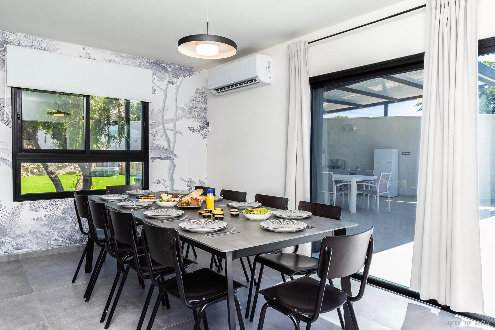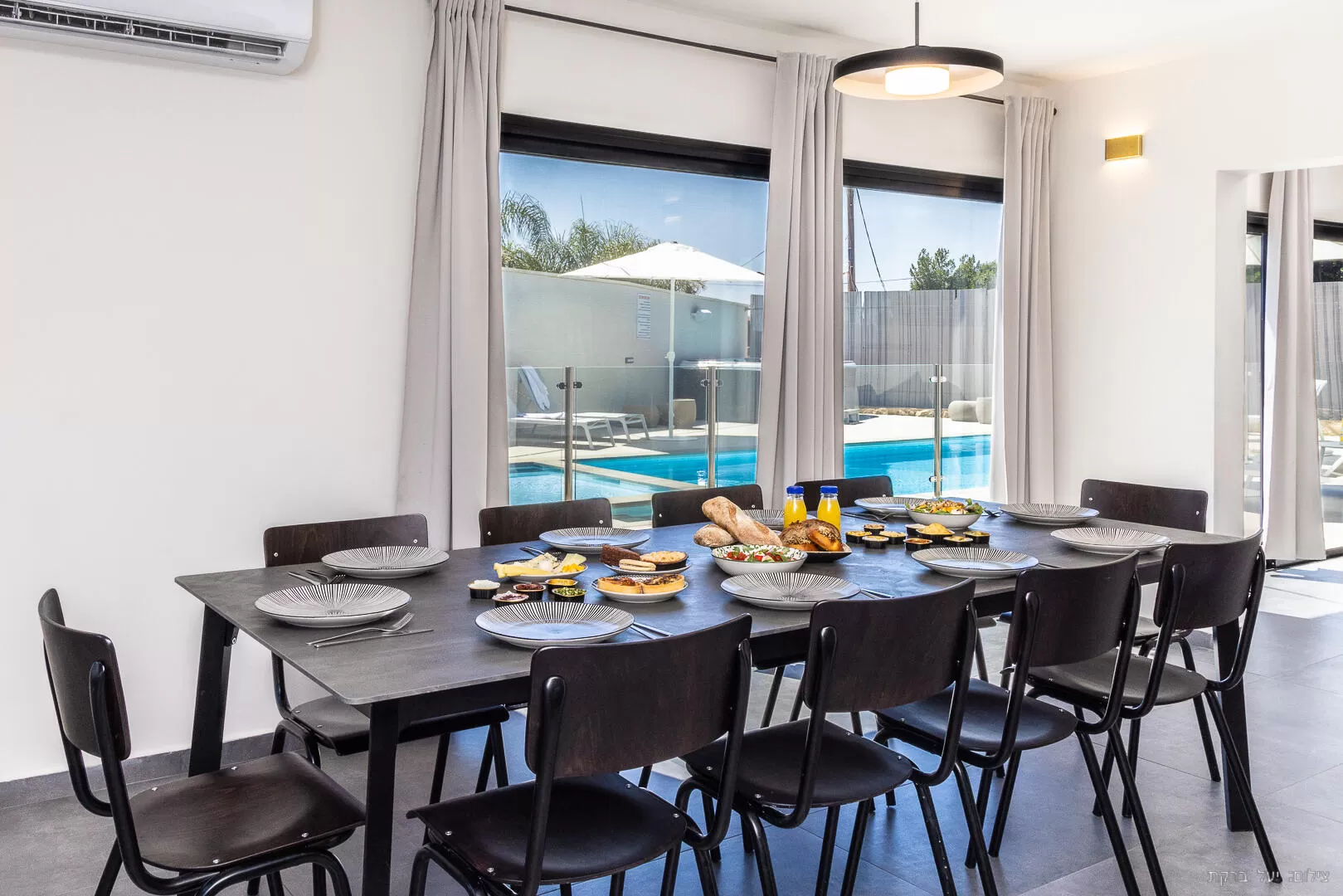 אזור המטבח והסלון מתחברים זה לזה בזרימה נעימה בתוך חלל משותף. האזור כולו מוקף בהמון חלונות גדולים ובדלת הזזה שפונה לאזור החוץ, מה שמכניס המון אור ואנרגיה טובה לחלל. במטבח יש אי גדול ונוח שפתוח לכיוון פינת האוכל, והאבזור שלו יספק לחלוטין את הבשלנים שביניכם. בסלון המינימליסטי תמצאו ספה "פופית" שמזמינה לרביצה ממושכת מול הטלוויזיה, כשהבריכה היפהפייה מסיטה את תשומת הלב לשמאל.