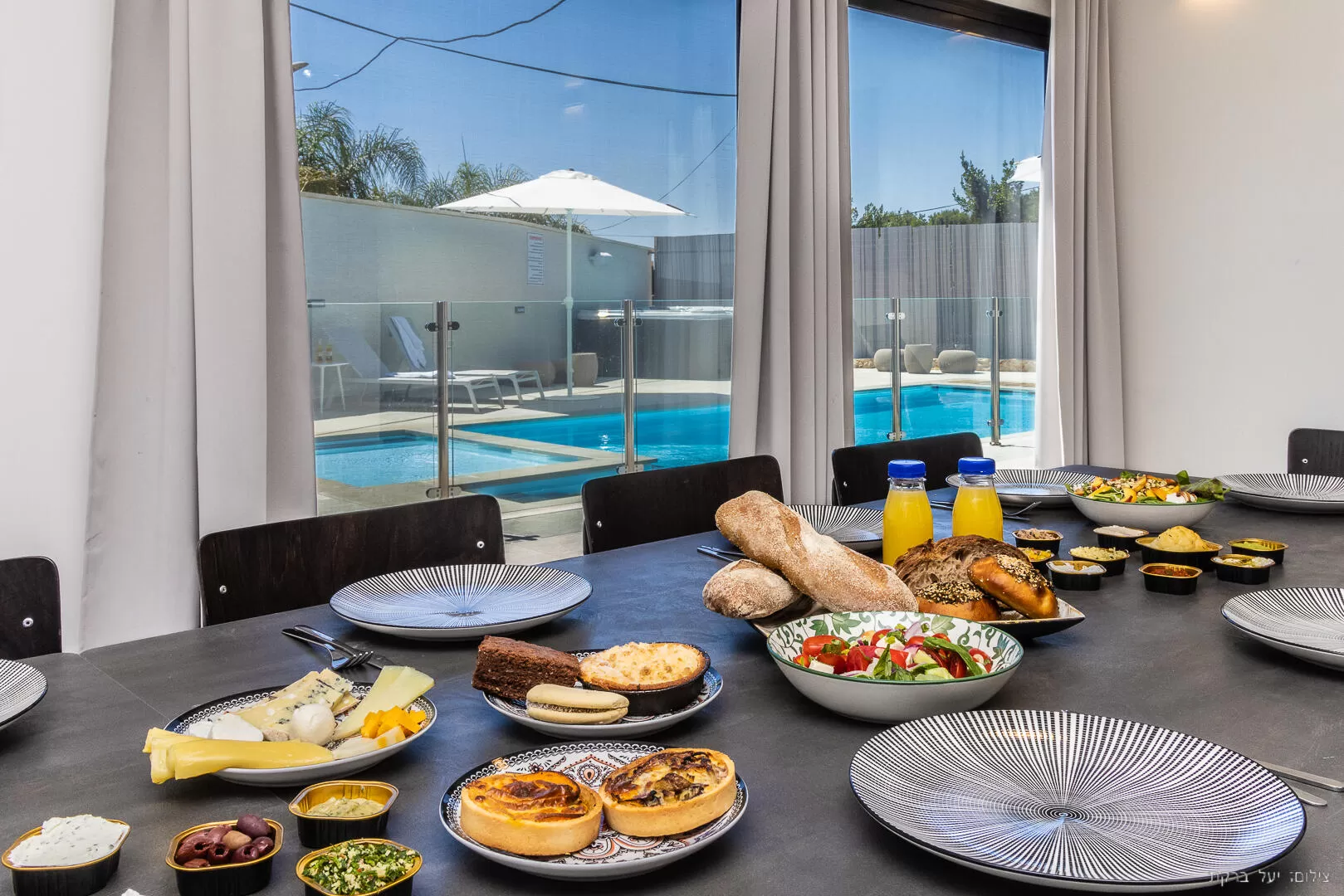 במתחם החוץ תמצאו בריכה גדולה ומפנקת (מחוממת ומקורה בחורף) עם בריכת ילדים מובנית בתוכה, וגידור בטיחותי סביבה. לא רחוק ממנה ממוקם ג'קוזי ספא שמתאים ל-7 רוחצים, ומתחת לפרגולה גדולה תמצאו פינת מטבח עם עמדת ברביקיו בנויה מאבן, שולחן אוכל גדול, שולחן סנוקר ופינת ישיבה סלונית אלגנטית. לצד אזור הישיבה יש שולחן פינג פונג, קונכיית רביצה ומדשאה (סינטטית) גדולה שמאפשרת לקטנים שבחבורה להתרוצץ בחופשיות.