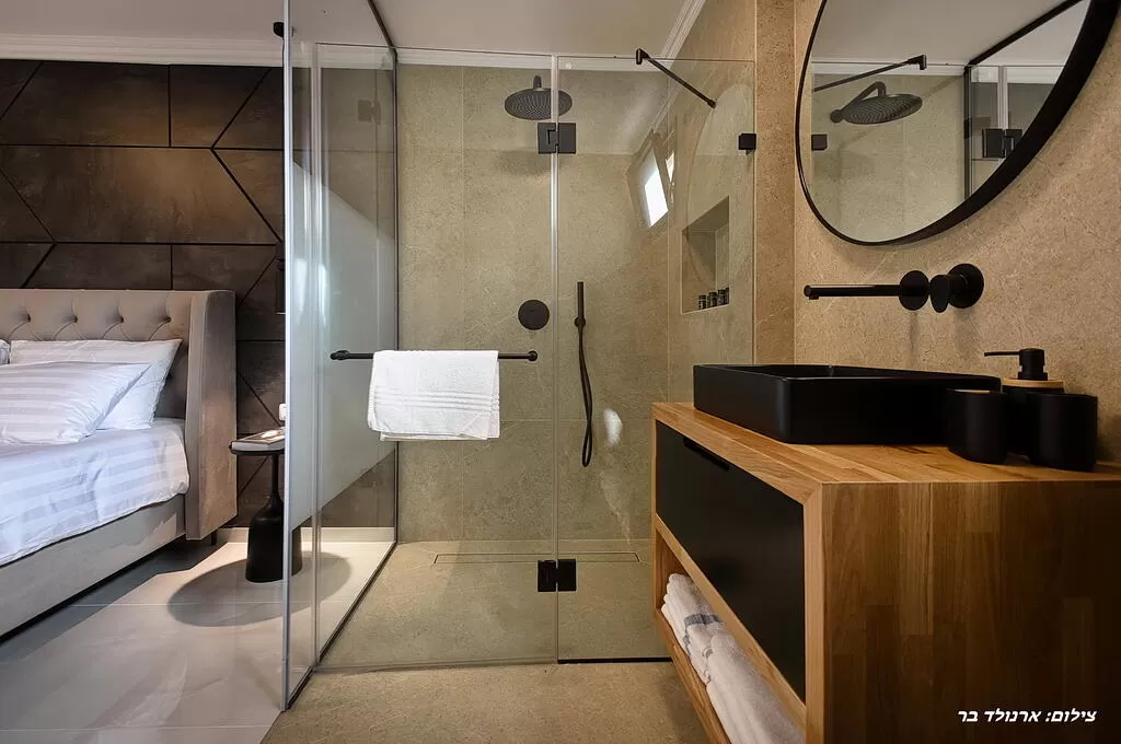 הוייב הזה ממשיך להפתיע גם בחדרי השינה ששומרים על הקו המינימליסטי הגבוה, ובמיוחד בחדרי הרחצה שהם יוצאי דופן ביופיים ועיצובם: מחיצות של זכוכית שקופה וחלבית, ברזים מוזהבים, פיסות קרמיקה גדולות וראשי גשם כפולים שיוצרים חווית רחצה מפנקת במיוחד.