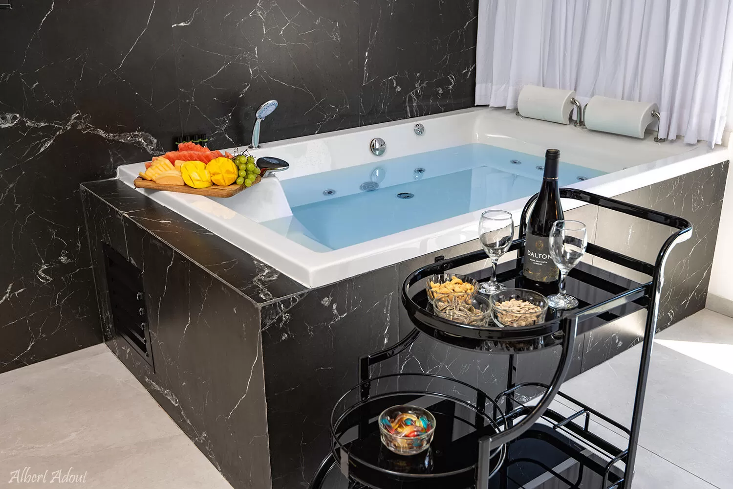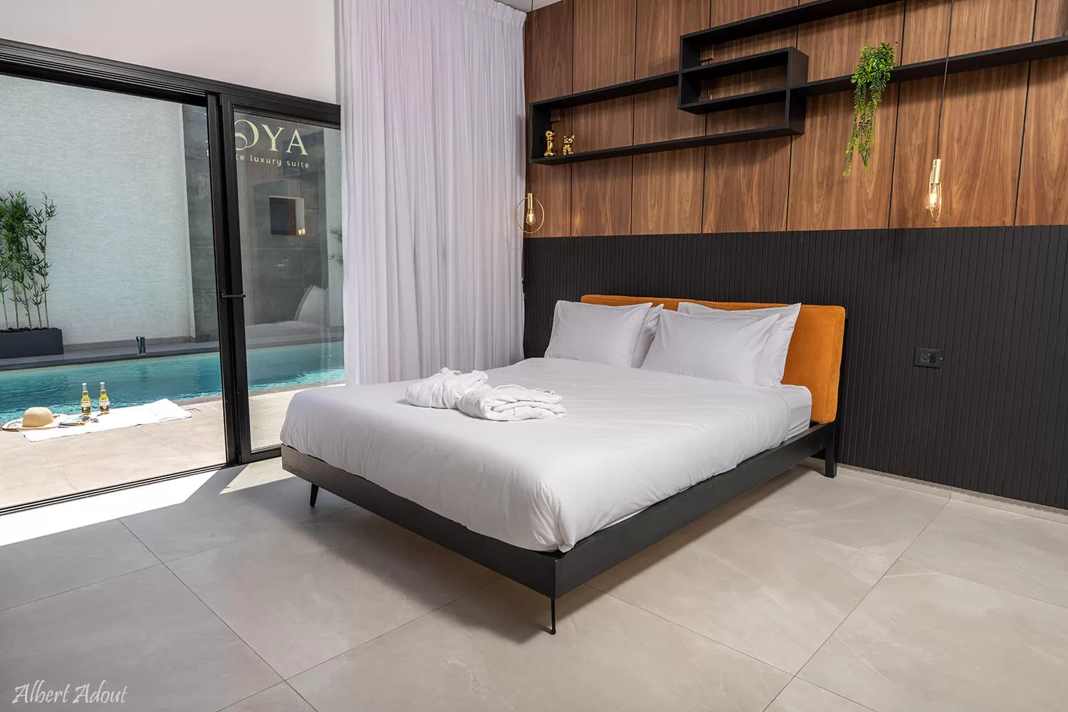 רויה היא סוויטה זוגית בגודל 40 מ"ר שיושבת על שטח של חצי דונם - מה שאומר שמרחב לא חסר פה. הסוויטה בנויה כחלל אחד פתוח, עם דלת הזזה שקופה שממנה יש יציאה ישירה לבריכה. העיצוב פה משחק בין גוונים של שחור דרמטי (הג'קוזי והמטבח), קרם בהיר (רצפת השיש היפה) וחיפויי עץ שפוגשים אותנו באזור השינה, בחדר הרחצה האלגנטי, ובבר הישיבה היפה שלצד המטבח.