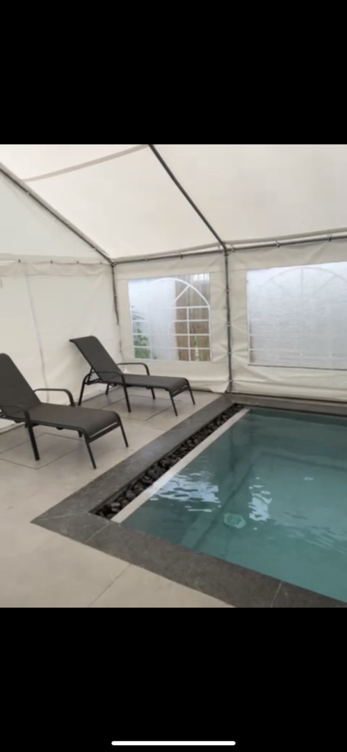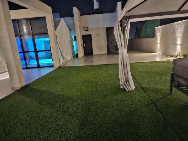 מתחם החוץ גם ממשיך את הקו המודרני. יש כאן בריכה פרטית מחוממת וסופר מפנקת, עם מקלחת חוץ יוקרתית לצידה, מיטות שיזוף, והמון מרחב. חלקו של המתחם מרוצף ובחלקו פרוש דשא סינטטי שמוסיף רעננות בגוון הירוק שלו. במרחב יש גזיבו גדול עם פינת ישיבה שמזמינה לרביצה כיפית, עמדת מנגל נוחה לעבודה (לא לשימוש בשבת), שולחן אוכל לארוחות חוץ מהנות, ודשא שמוסיף רעננות בגוון הירוק שלו.