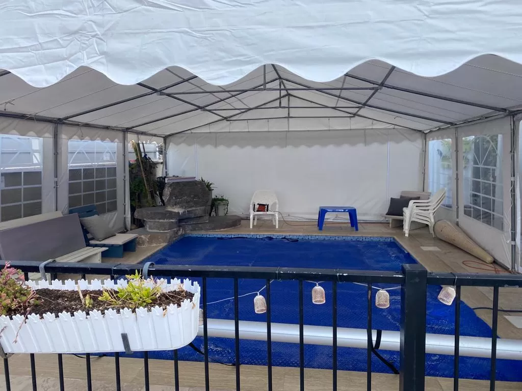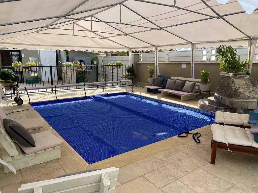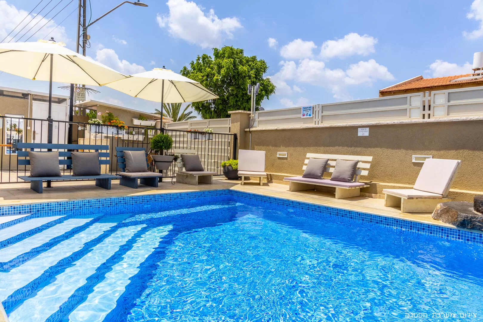 מתחם החוץ הסופר מטופח של הסוויטה כולל בריכה יפה ונעימה לרחצה בכל עונות השנה (מקורה), עם מפל שזורם מסלע גדול ישר לתוכה, פינות ישיבה מפנקות תחת שמשיות גדולות, ערסל נדנדה ארוג, ומיטות שיזוף שכיף לרבוץ עליהן בין טבילה לטבילה. האבזור לצד הבריכה כולל בין היתר עמדת מנגל פחמים, מקלחת חוץ מרעננת, וחדר שירותים שחוסך את העליה למעלה, וזה בהחלט בונוס. המרחב כולו מושקע עם המון תשומת לב ופזורים כאן שפע של עציצים, פרחים וצמחים שעושים הרגשה טובה, והאווירה היא פרטית ושקטה.