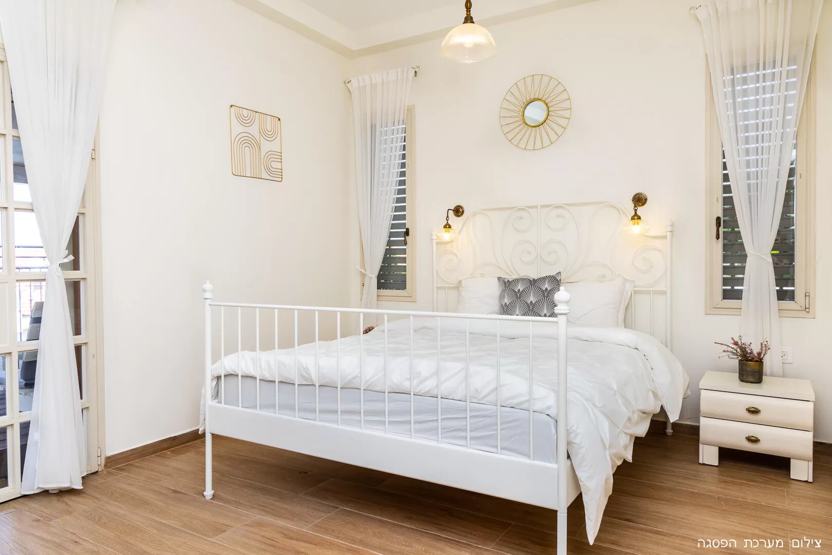 הסוויטה עצמה מורכבת משני מפלסים שדלת מפרידה ביניהם. במידה ואתם זוג עם עד ילד אחד, ייפתח לשימושכם המפלס התחתון. החלל שלו בנוי כ"אופן ספייס" שמעוצב בגוונים בהירים, לבנים ונקיים. הקו העיצובי של הסוויטה הוא כפרי-מודרני ומעודן, והטאצ' האישי של המארחים מורגש כאן בפרטים הקטנים. באזור השינה יש מיטה זוגית קינג סייז לבנה ויפה עם שידות אלגנטיות לצידה, עיטורי קיר עדינים, ואהילי וינטא'ג מזכוכית שתלויים ברחבי החלל ומאירים אותו באור עדין. טלוויזיה גדולה ניצבת מול המיטה, ומעברה השני נמצא מטבח שמאובזר באופן בסיסי, וחדר הרחצה שמכיל אמבטיה עם ראש גשם מפנק. רצפת פרקט יפה מוסיפה חמימות, והתחושה הכללית כאן היא של יופי ורוגע.