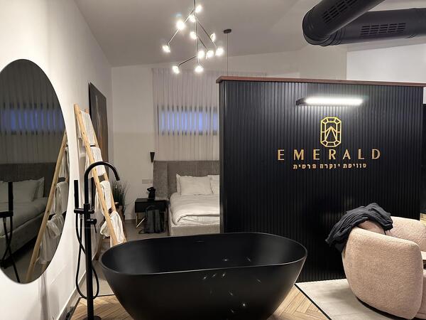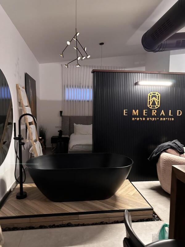 סוויטה עם בריכת אינפיניטי פרטית, אמבט שחור מהודר במרכז החדר, עיצוב יוקרתי ואווירה מוקפדת - אמרלד היא סוויטה לאנשים של הפרטים הקטנים