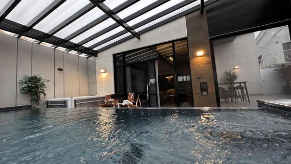 חזית הסוויטה שקופה ומאפשרת מבט אל הבריכה ואל היופי שבחוץ. חלל הפנים מעוצב בגוונים של שחור ובז', בשילוב אלמנטים של תאורה ייחודית, מראות, ואקססוריז שמוסיפים למקום הזה אופי והופכים אותו לייחודי בנוף.