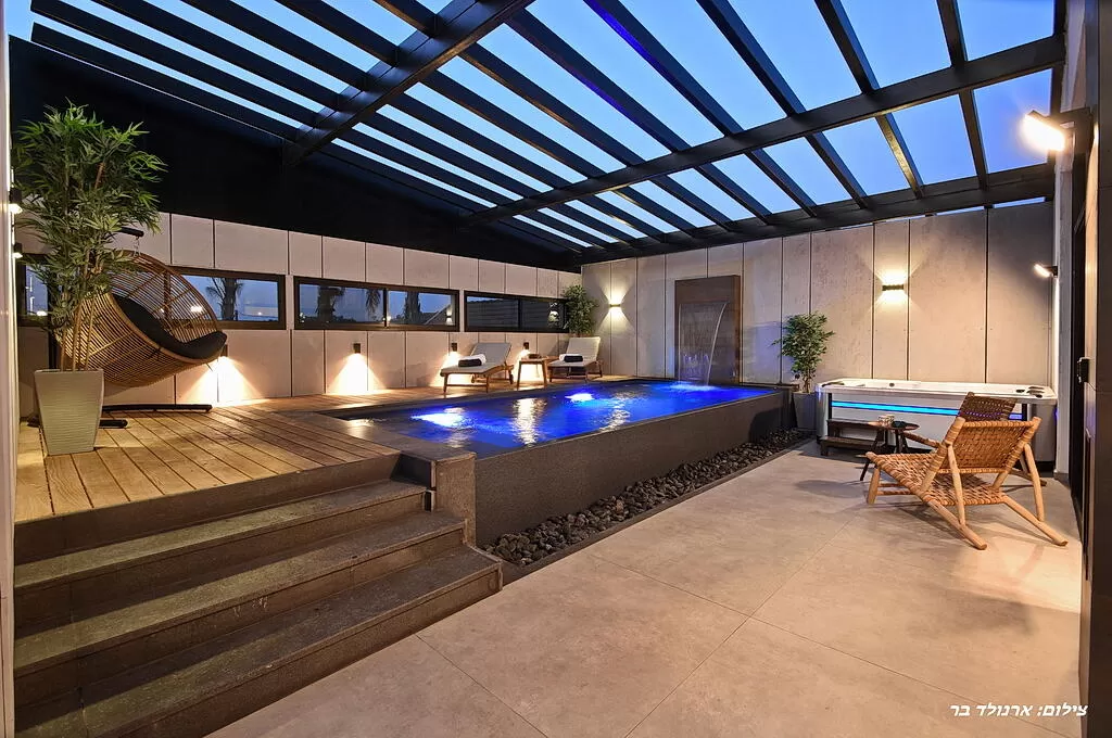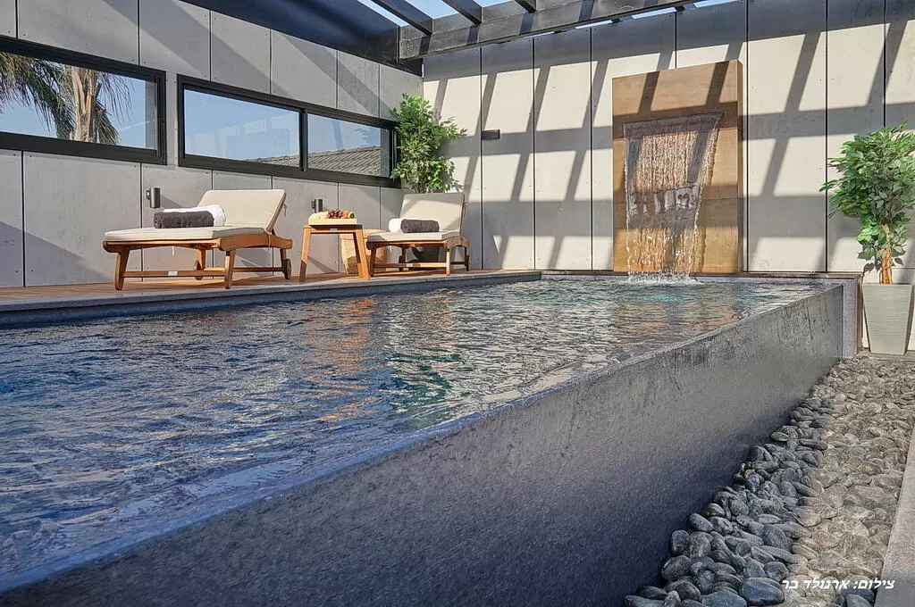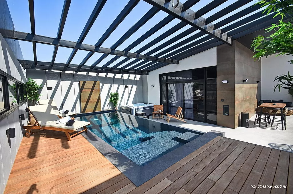 תחת פרגולה שחורה שמעניקה צל חלקי ואפשרות להנות גם מהשמש, נמצאת בריכת אינפיניטי (מחוממת) עם מפל מפנק ומרשים. כשתרצו להעלות קצת את הטמפרטורות תוכלו לקפוץ לג'קוזי ספא הצמוד, וכשתתעייפו מכל הטוב הזה תוכלו פשוט להתרווח ולהרגע על ערסל או מיטת שיזוף שמחכה רק לכם. לאוהבי ה"על האש" מחכה כאן עמדת ברביקיו פחמים באוויר הפתוח.