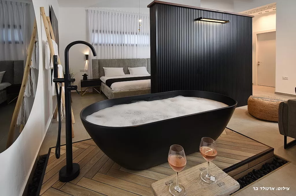 סוויטה עם בריכת אינפיניטי פרטית, אמבט שחור מהודר במרכז החדר, עיצוב יוקרתי ואווירה מוקפדת - אמרלד היא סוויטה לאנשים של הפרטים הקטנים