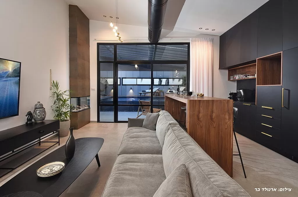 חזית הסוויטה שקופה ומאפשרת מבט אל הבריכה ואל היופי שבחוץ. חלל הפנים מעוצב בגוונים של שחור ובז', בשילוב אלמנטים של תאורה ייחודית, מראות, ואקססוריז שמוסיפים למקום הזה אופי והופכים אותו לייחודי בנוף.