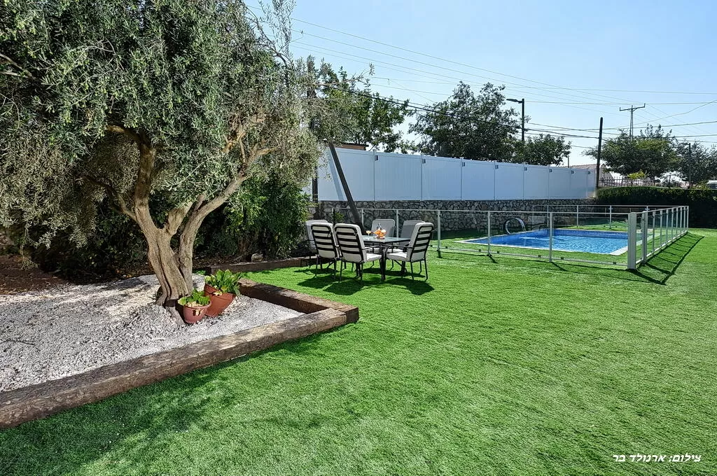 חצר גדולה עם בריכה פרטית, מחוממת בחיטוי מלח (לא כלור)