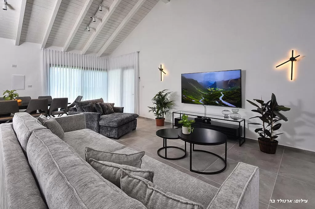 הווילה בנויה במפלס אחד, ומעוצבת בסטייל מודרני ופשוט. המטבח נעים ומאובזר ומאפשר לבשלנים שביניכם להכין ארוחות מפוארות. אזור הסלון מרווח ונעים עם תקרת רעפים משופעת גבוהה ולבנה, שמוסיפה נפח מואר לחלל כולו. הגוונים ששולבו בעיצוב הפנים בהירים ונעימים לעין, וגופי תאורה מעוצבים יוצרים תאורה נעימה ויוקרתית בערב. כשתתכנסו לצפייה בסלון, תוכלו ליהנות מטלוויזיה חכמה בטכנולוגיית OLED, שמעניקה חווית צפייה איכותית ביותר. חצר הווילה והבריכה נשקפת מהחלונות הגדולים שכאן, ומכניסה את החוץ פנימה בצורה נעימה.