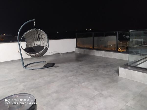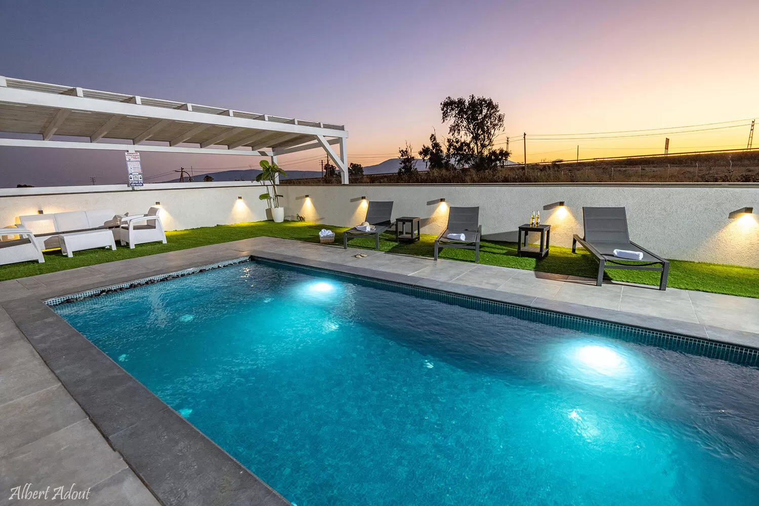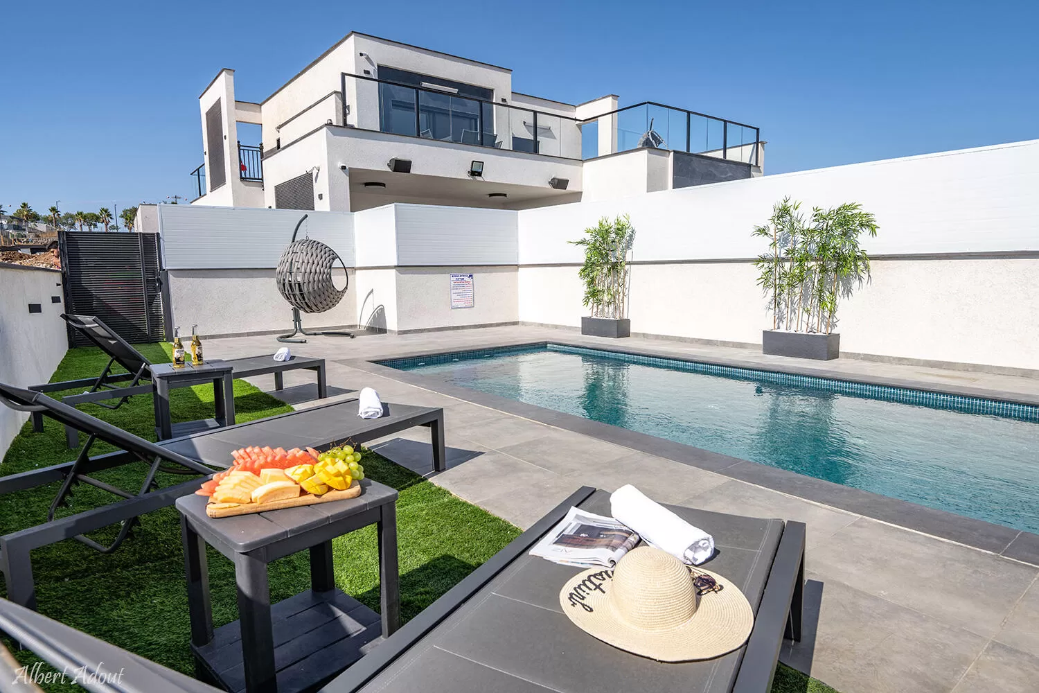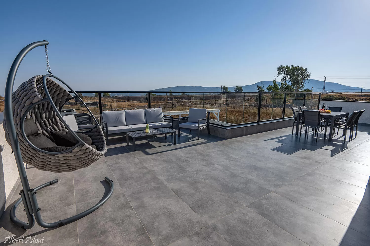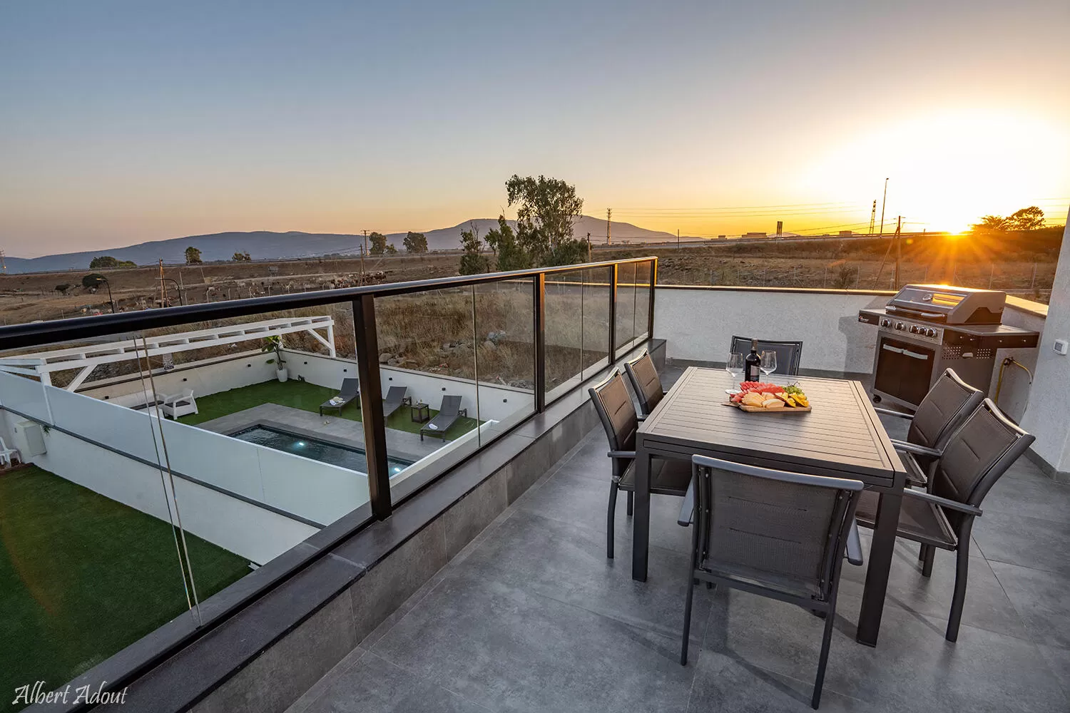 מתחם החוץ של הסוויטה ממשיך את העיצוב הנקי, והגוונים שנבחרו עבורו יוצרים מראה אסתטי. יש כאן בעצם חלוקה לכמה אזורים שחלקם בקומת הכניסה (הבריכה ואזור המשחקים) וחלקם בקומה העליונה (מרפסות נוף). מתחם הבריכה מגודר כולו וממוקם בנפרד עם שער שניתן לסגור לשם הבטיחות והפרטיות. הבריכה יפה ומזמינה, בנויה בגובה הרצפה עם סיומת של חלוקי נחל אלגנטיים, והבונוס - היא מחוממת כל השנה. סביבה תוכלו להתפנק במיטות שיזוף, ערסל נדנדה, ופינת ישיבה שנמצאת מתחת לפרגולה לבנה שיוצרת הצללה נעימה (וחשובה). המרפסת העליונה של הסוויטה מרגישה מלכותית משהו בשל גובהה ובשל העובדה שהיא נפתחת אל הנוף. אפשר לצאת אליה ישר מהסלון, ולהנות משלל פינוקיה: עמדת מנגל איכותית, פינת אוכל נעימה, ופינת ישיבה כיפית שמשקיפה למתחם הבריכה, לנוף ההררי, ולשקיעות היפות. בכניסה למתחם הסוויטה יש אזור נפרד עם משחקים לילדים ושולחן פינג פונג.