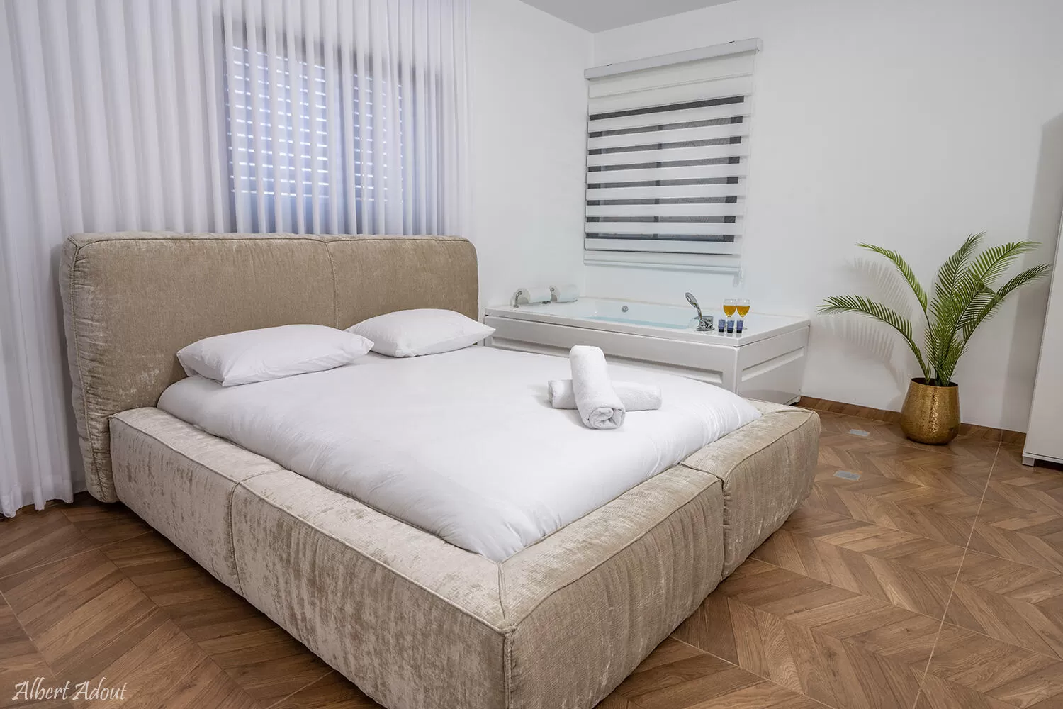 בסוויטת עדיה שני חדרי שינה מרווחים, וניתן לארח פה עד 10 נופשים. בשני חדרי השינה יש רצפת פרקט נעימה שמוסיפה חמימות לחללים, ושאר העיצוב פונקציונלי ונקי. בחדר אחד (שמשמש כיחידת הורים) יש ג'קוזי זוגי לצד המיטה, ויציאה פרטית למרפסת. בחדר השינה השני בנוסף למיטה הזוגית יש מיטת יחיד ומיטת קומותיים. שני חדרי השינה חולקים חדר רחצה ושירותים אחד שמעוצב בפיסות של שיש בהיר ואלגנטי לצד ברזים בגוון מוזהב שמשתלבים פה נהדר.