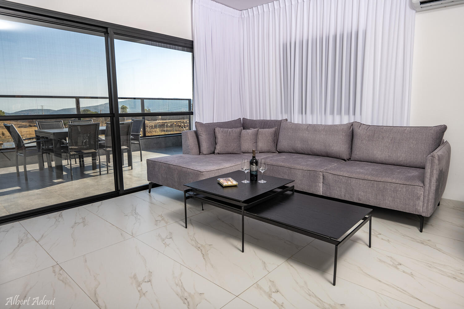 המטבח מאובזר ומתאים לבישול קל ולצידו תמצאו פינת אוכל נוחה, וחלל סלון שבו ספה נעימה לרביצה וטלוויזיה גדולה. דלת הזזה שקופה וגדולה מובילה אותנו מכאן למרפסת הנוף (שהיא עולם ומלואו בפני עצמה) דרכה נכנס גם המון אור טבעי שמאיר את החלל.