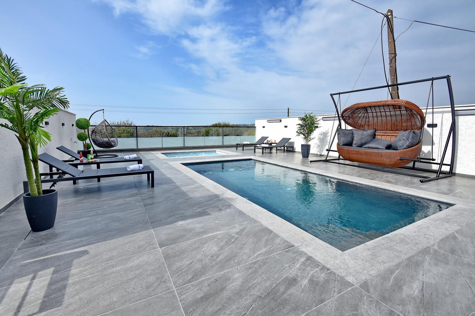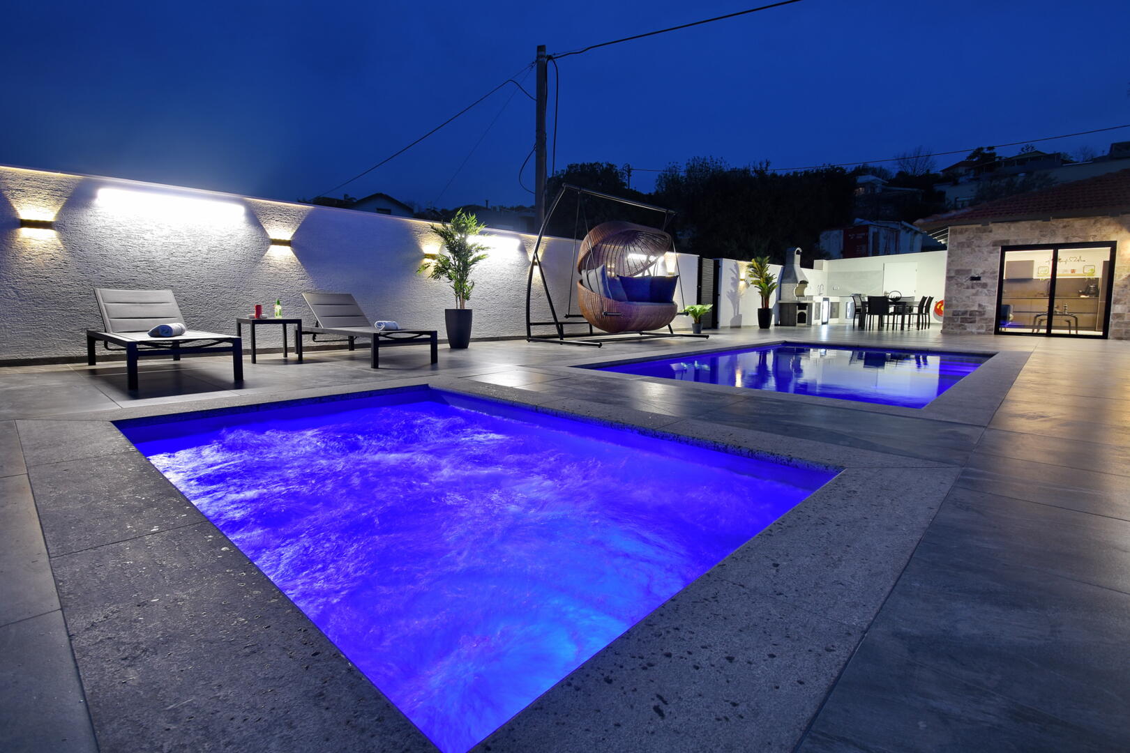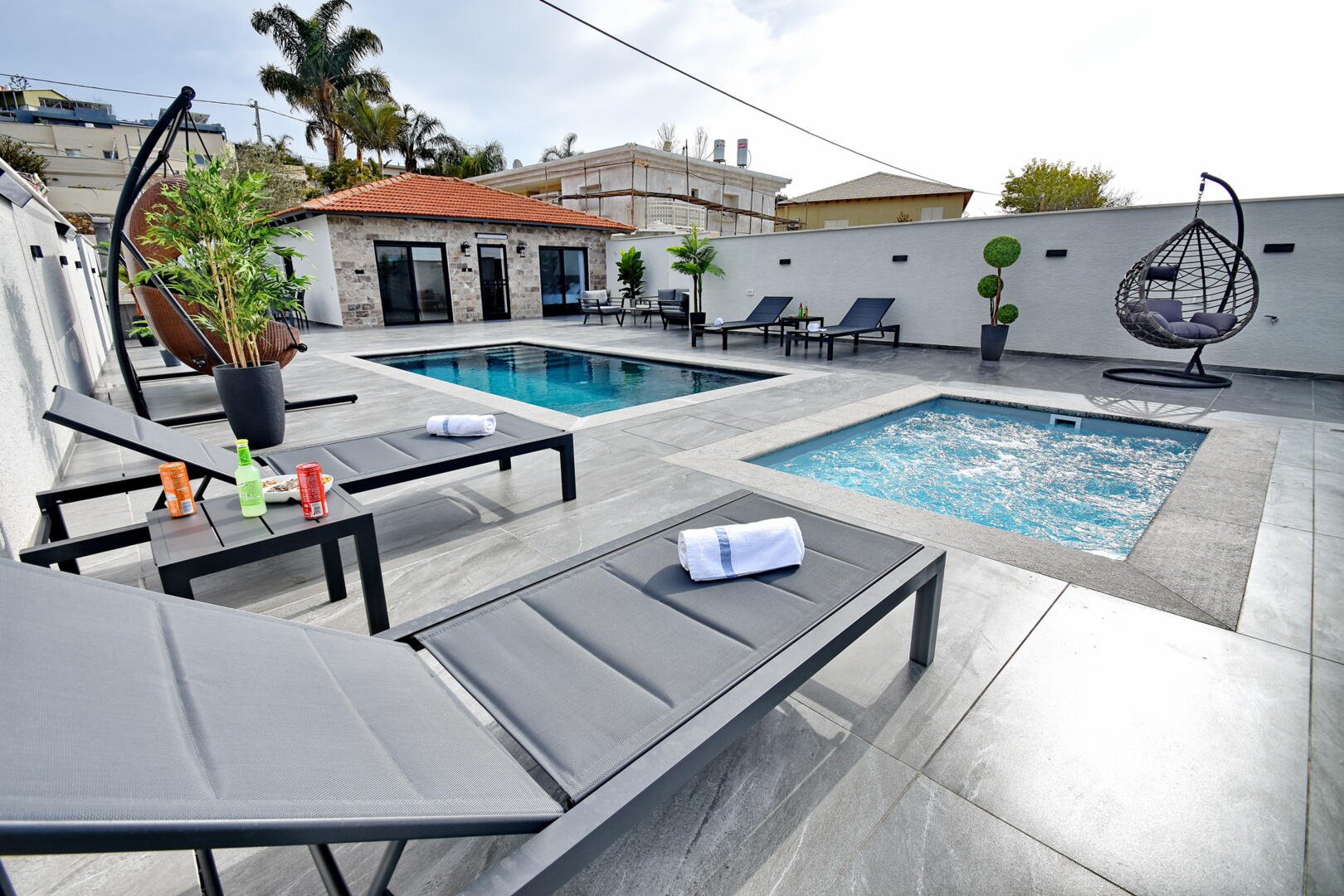 הבריכה והג'קוזי שניהם בנויים ושקועים בגובה הרצפה: הג'קוזי ענק ומתאים ל-12 רוחצים, הבריכה מחוממת כל השנה ומגיעה לעומק של 140 ס"מ. פינות ישיבה וערסלים בעיצוב ייחודי מחכים לכם כאן, לצד מטבח חיצוני מאובזר בכל הדרוש לבישול ולברביקיו איכותי, ומי מכם שיהיה אחראי על העמדה, יוכל להנות מפחיות שתיה קרה שימתינו לו פה.