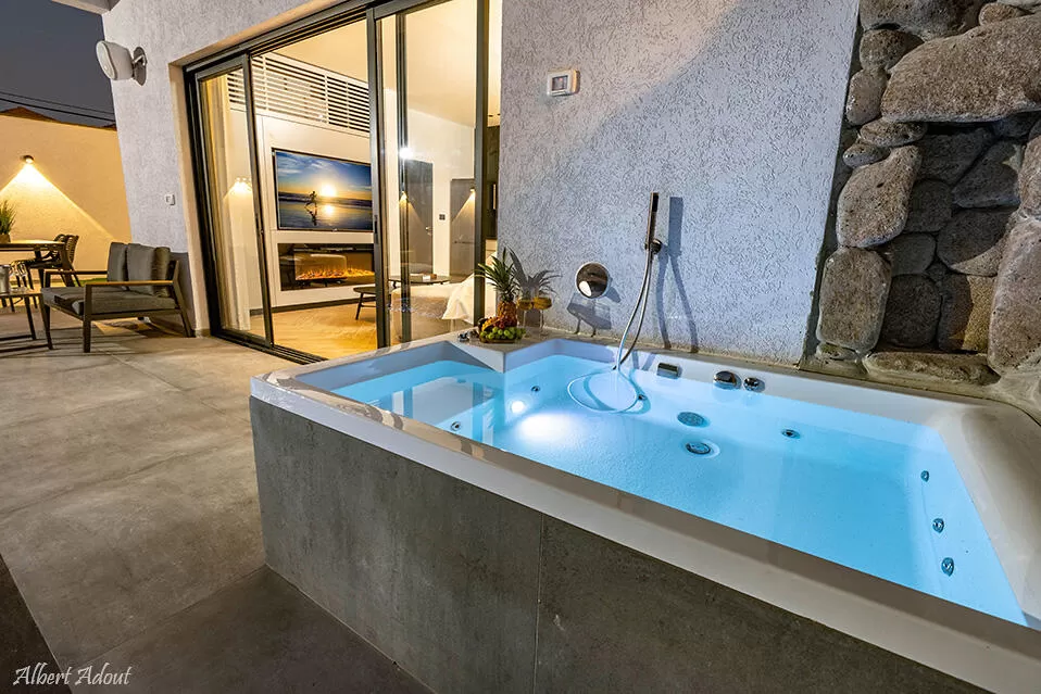 מתחם החוץ של הסוויטות שופע נוחות וסטייל, ותוכלו ליהנות גם מפרטיות מלאה. הצצה קטנה מעבר לחומת אבני הבזלת מגלה את נוף הגבעות וההרים הגלילי. יש כאן בריכה מחוממת יפהפיה הבנויה בגובה הרצפה עם חלוקי נחל בשוליה, ג'קוזי מפנק שניצב בסמוך אליה, מקלחת חוץ מפנקת, פינת ברביקיו נוחה לעבודה, ובנוסף תוכלו ליהנות כאן מרמקולים ותאורת חוץ שמשאירים את המתחם רלוונטי ומהנה גם בלילה.