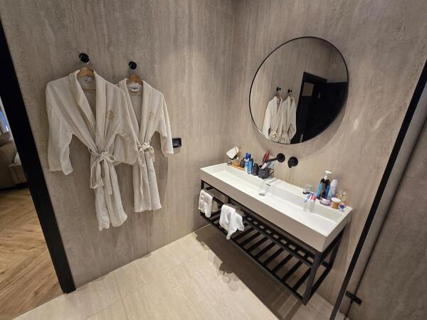 חדר הרחצה הוא סופר אלגנטי, מעוצב בגוון בהיר עם שני ראשי גשם מפנקים והמון ספייס.