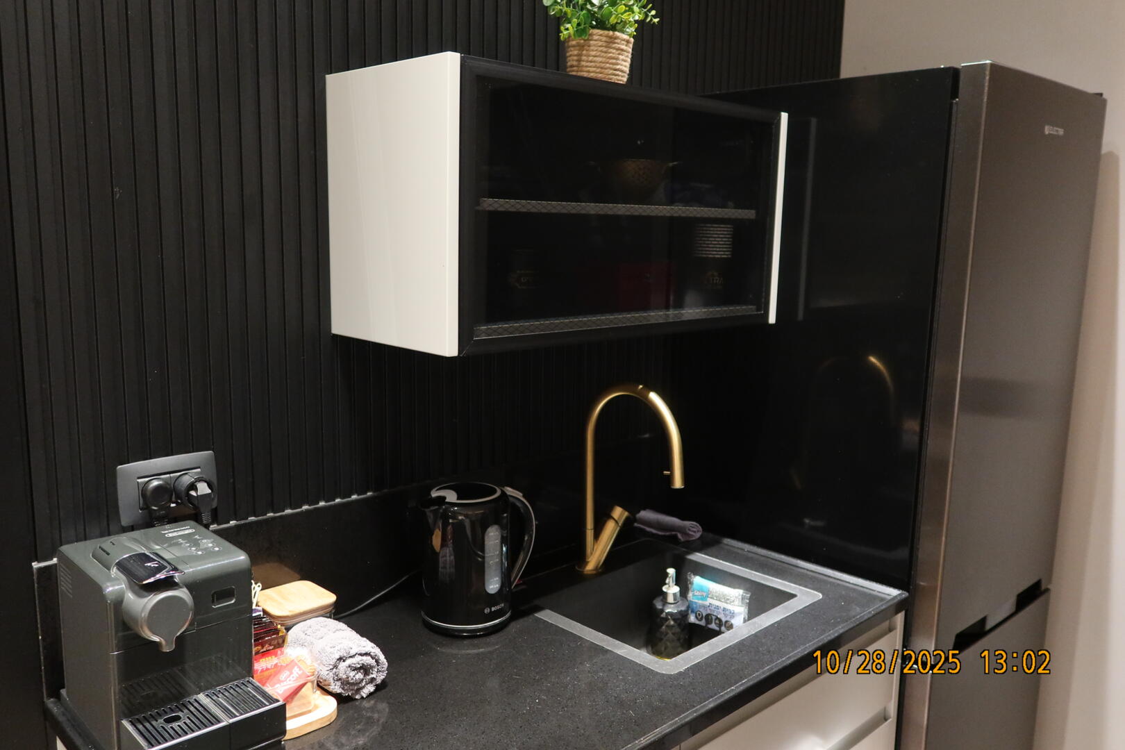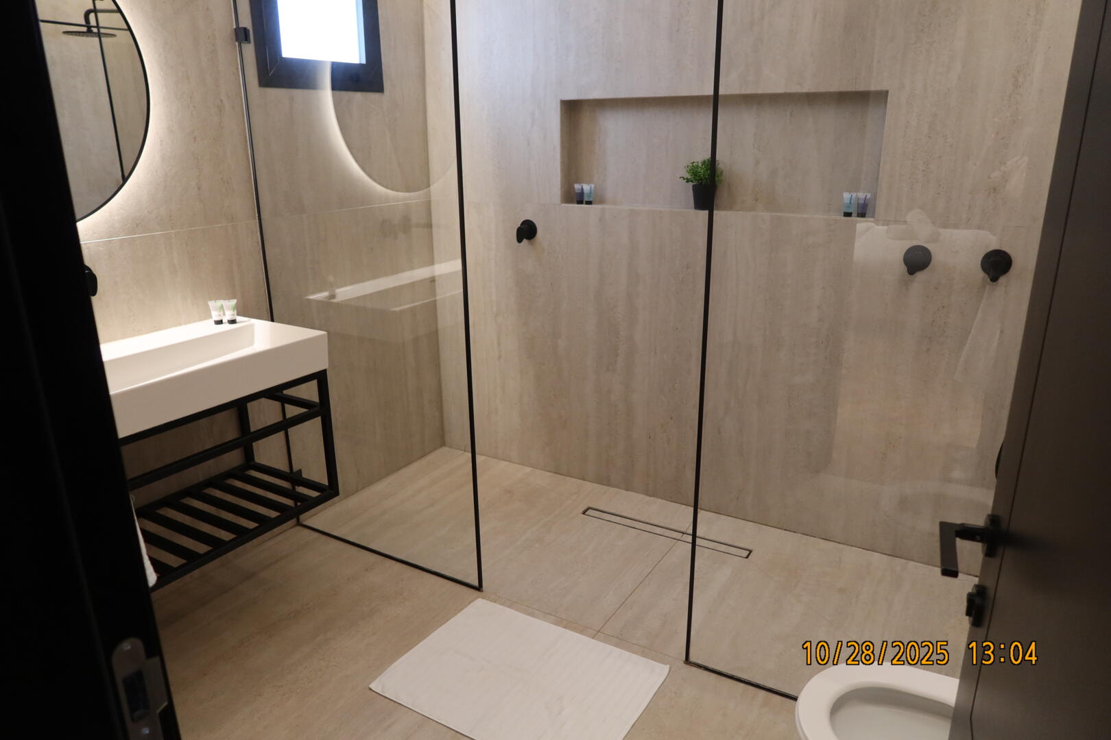 חדר הרחצה הוא סופר אלגנטי, מעוצב בגוון בהיר עם שני ראשי גשם מפנקים והמון ספייס.