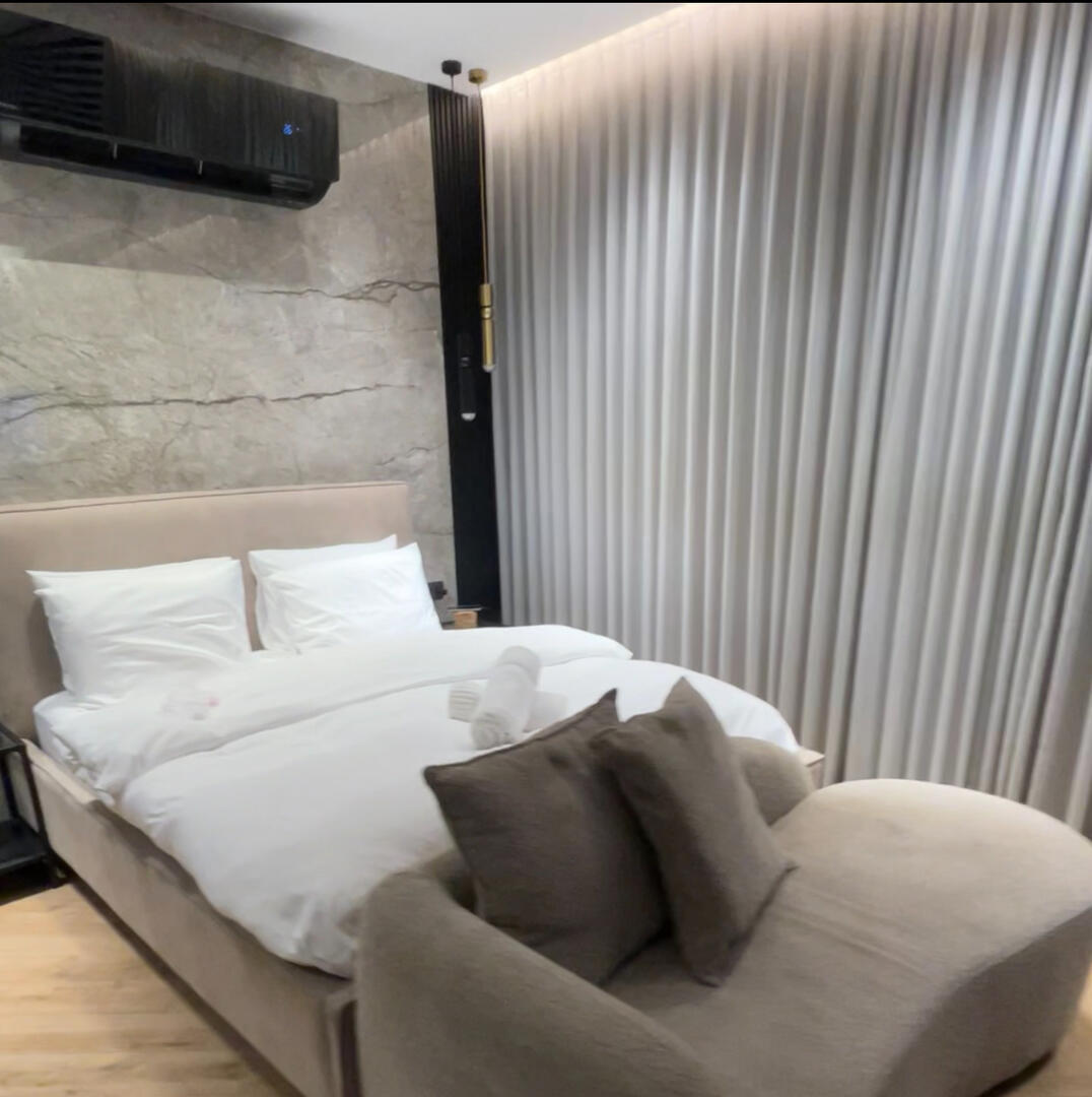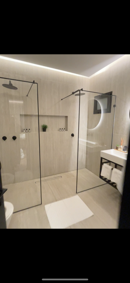 חדר הרחצה הוא סופר אלגנטי, מעוצב בגוון בהיר עם שני ראשי גשם מפנקים והמון ספייס.