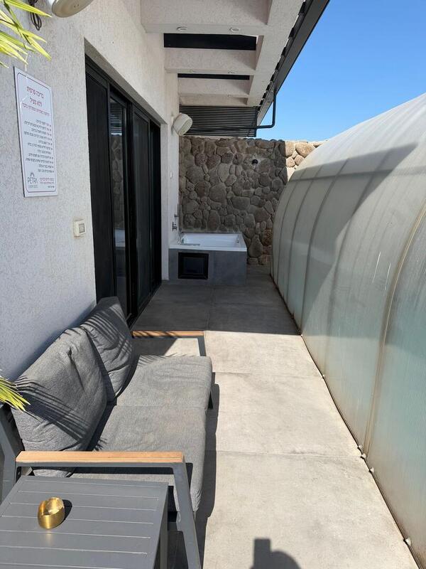 מתחם החוץ של הסוויטות שופע נוחות וסטייל, ותוכלו ליהנות גם מפרטיות מלאה. הצצה קטנה מעבר לחומת אבני הבזלת מגלה את נוף הגבעות וההרים הגלילי. יש כאן בריכה מחוממת יפהפיה הבנויה בגובה הרצפה עם חלוקי נחל בשוליה, ג'קוזי מפנק שניצב בסמוך אליה, מקלחת חוץ מפנקת, פינת ברביקיו נוחה לעבודה, ובנוסף תוכלו ליהנות כאן מרמקולים ותאורת חוץ שמשאירים את המתחם רלוונטי ומהנה גם בלילה.