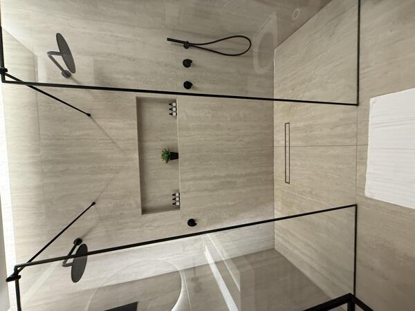 חדר הרחצה הוא סופר אלגנטי, מעוצב בגוון בהיר עם שני ראשי גשם מפנקים והמון ספייס.