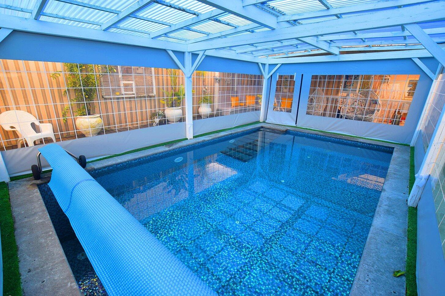 אורחי אחוזת קריסטל חולקים את מתחם החוץ, שכולל בריכה מחוממת (כל השנה), הממוקמת במתחם סגור עם שער. הבריכה עצמה מקבלת קירוי בחורף ומוקפת בצמחיה ירוקה,מגוון פינות ישיבה ומיטות שיזוף שכיף לרבוץ עליהן. אזור מקורה עם משחקים מציע לאוהבי הז'אנר שולחן כדורגל ושולחן וסנוקר, שבצידו חלון דרכו ניתן לצפות אל הנוף הגלילי שמסביב. כלוב של ציפורים ממוקם בתחם הבריכה, וציוצן נשמע בכל המתחם.