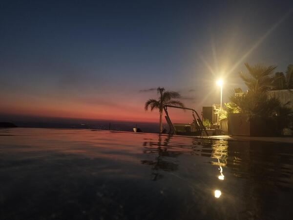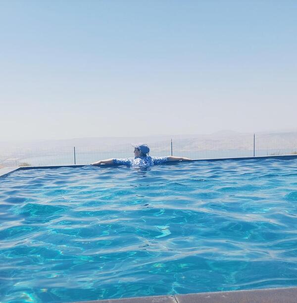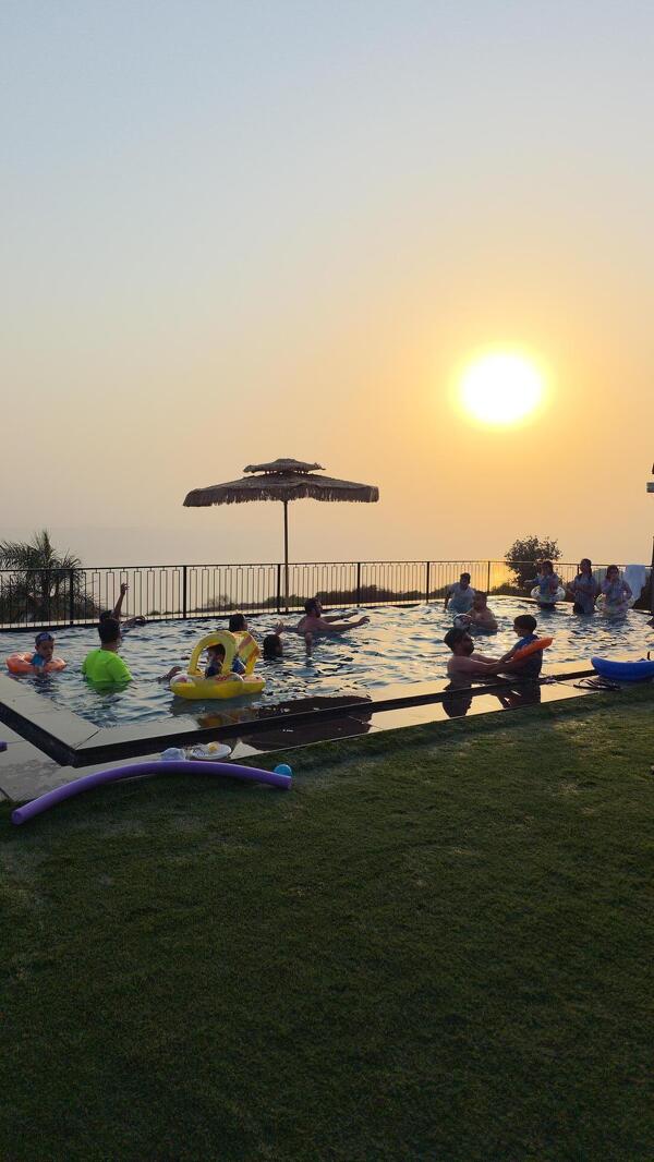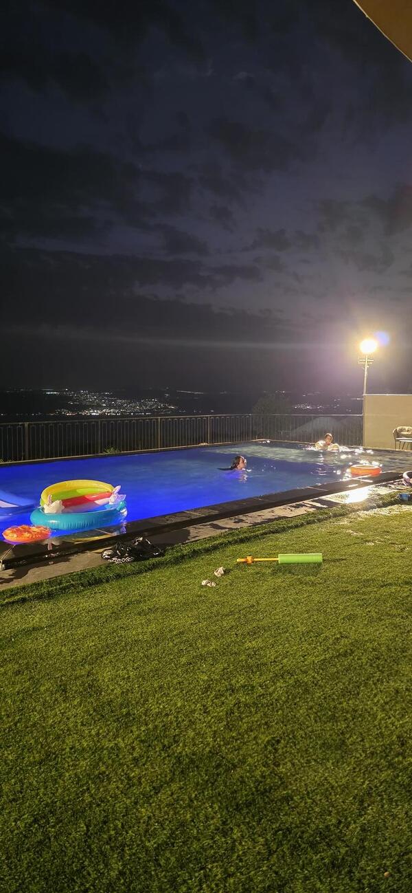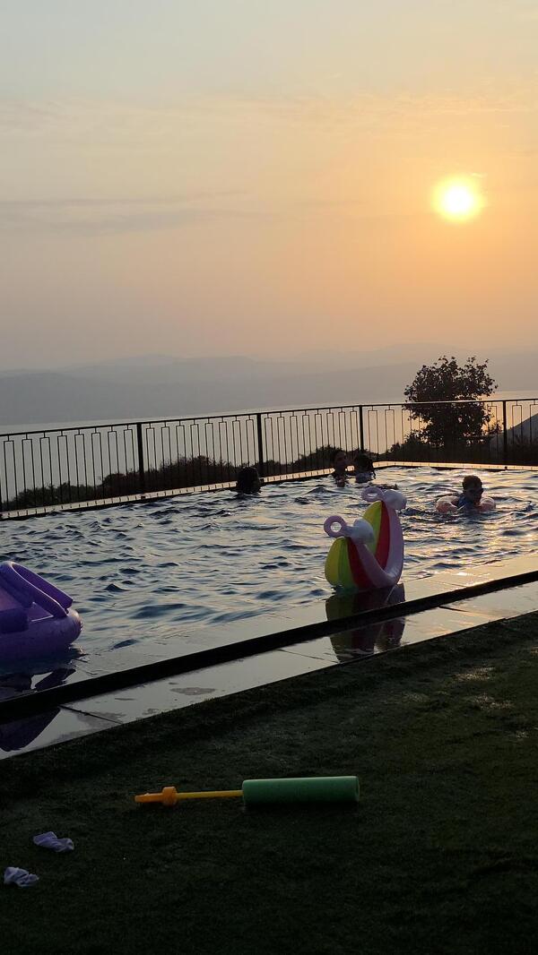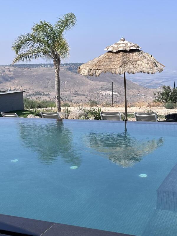 מתחם החוץ של הווילה מגיע הישר מעולם החלומות: המרחב כולו גדול מאוד, עם בריכת אינפיניטי מחוממת ומהממת ביופיה, שגולשת אל הנוף ומייצרת השתקפויות של מים, שמיים ואבני בזלת שאפשר למצוא רק ברמת הגולן. יש כאן מגוון אזורי ישיבה, ביניהם מיטות שיזוף "פופיות" לרביצה, פינת ישיבה בעבודת יד של עץ ואבן, שולחנות אוכל וכסאות - ובקיצור, כל מה שצריך כדי שתרגישו נוח, ובדיוק כמונו, תרצו רק להישאר כאן ולבהות אל הנוף.