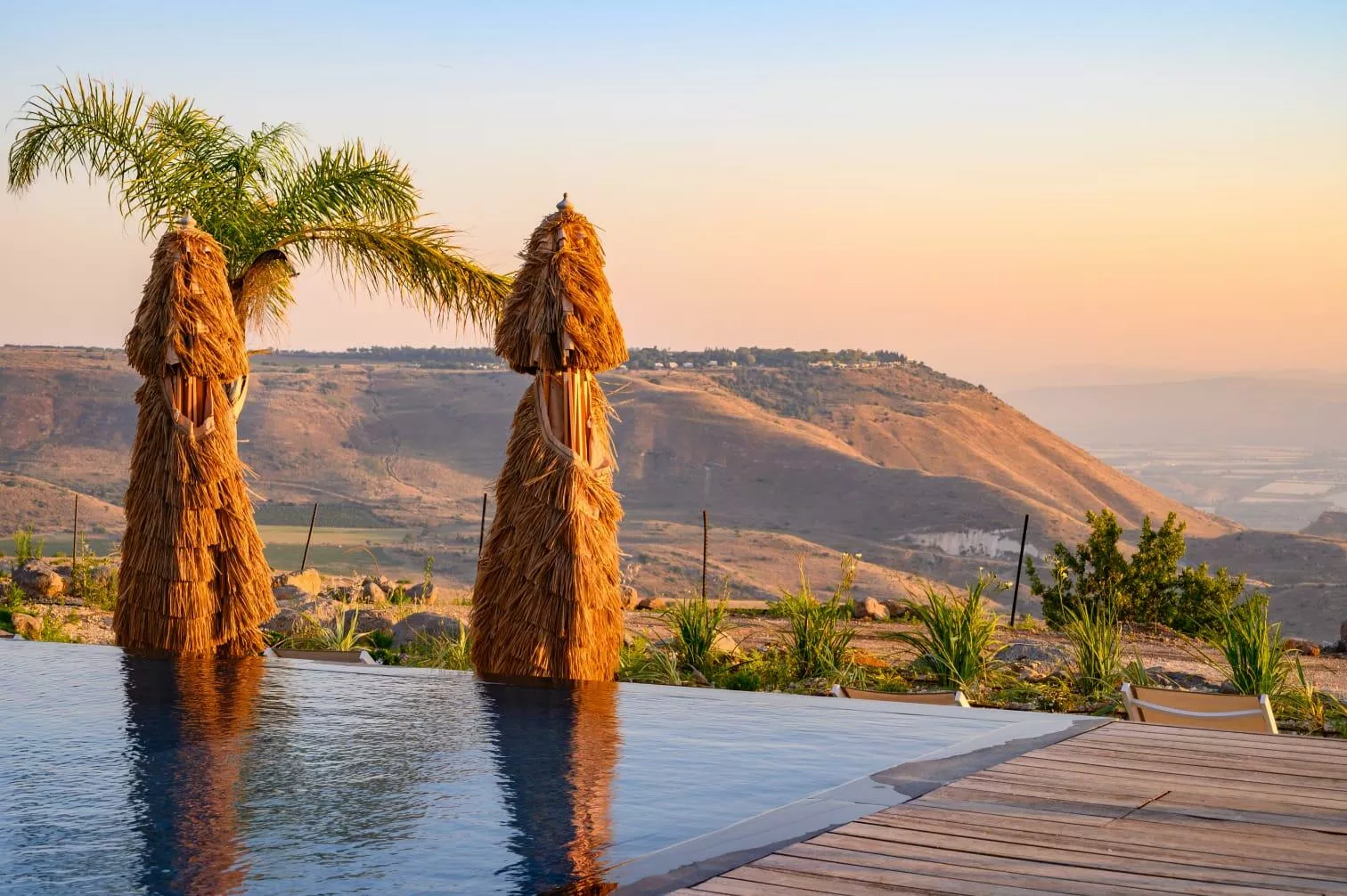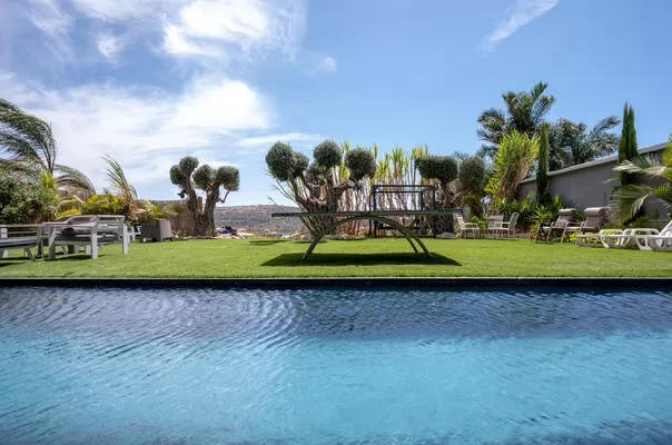 מתחם החוץ של הווילה מגיע הישר מעולם החלומות: המרחב כולו גדול מאוד, עם בריכת אינפיניטי מחוממת ומהממת ביופיה, שגולשת אל הנוף ומייצרת השתקפויות של מים, שמיים ואבני בזלת שאפשר למצוא רק ברמת הגולן. יש כאן מגוון אזורי ישיבה, ביניהם מיטות שיזוף "פופיות" לרביצה, פינת ישיבה בעבודת יד של עץ ואבן, שולחנות אוכל וכסאות - ובקיצור, כל מה שצריך כדי שתרגישו נוח, ובדיוק כמונו, תרצו רק להישאר כאן ולבהות אל הנוף.