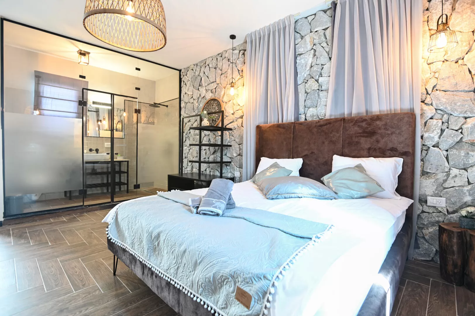 הודולה היא וילה מושקעת עם חמישה חדרים גדולים ומרווחים, כשלכל אחד מהם חדר רחצה יפהפה משלו. מה שתופס את תשומת הלב כאן הוא ללא ספק העיצוב הייחודי של החללים, שעושה שימוש בחומרים כמו עץ, אבן, זכוכית ומתכת, שביחד יוצרים יופי דרמטי ושקט. קיר האבן הגולמית בחדרי השינה הוא לא רק מפתיע ושובה לב, אלא מחבר אותנו לטבע שבחוץ, ויוצר תחושה טבעית ונינוחה.