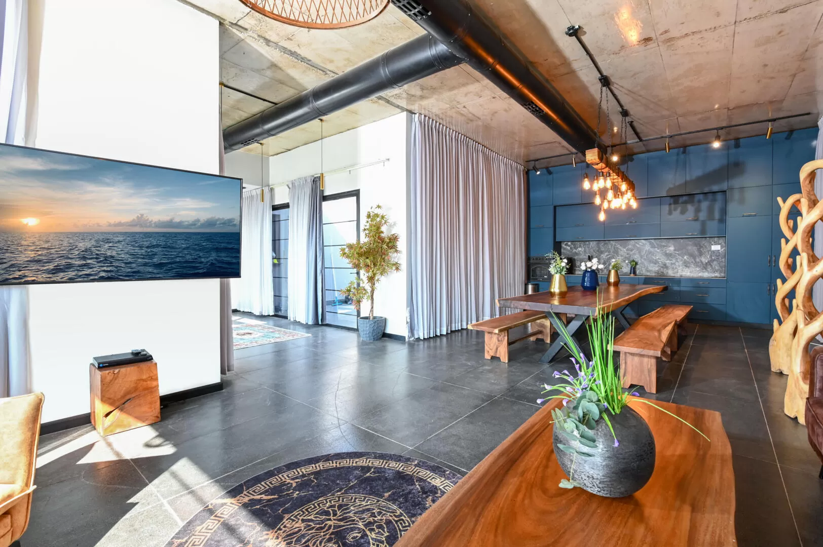 העיצוב הייחודי פוגש אותנו גם במרחב הסלון המרשים, במטבח שצבוע בכחול, ובפיסת העץ הארוכה ממנה בנוי שולחן האוכל הארוך. פסלוני עץ מקוריים, תאורה נכונה, ותקרת דמויית אבן מפתיעה משלימים את האווירה.