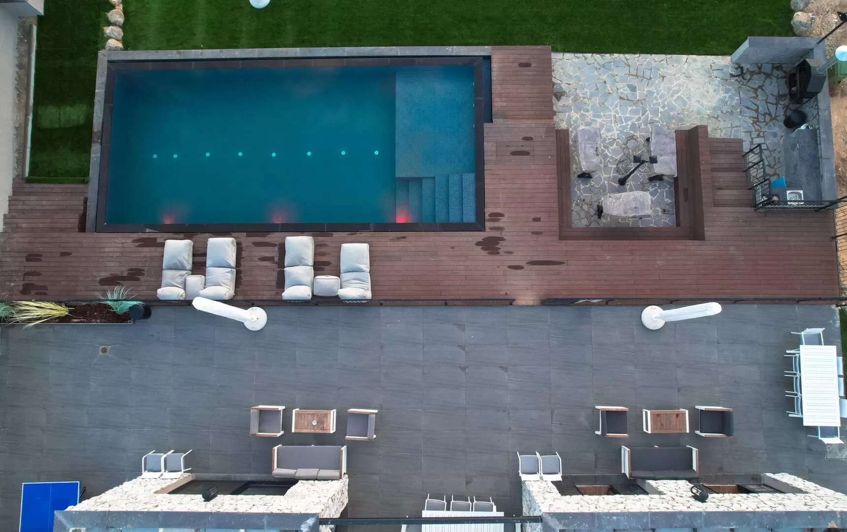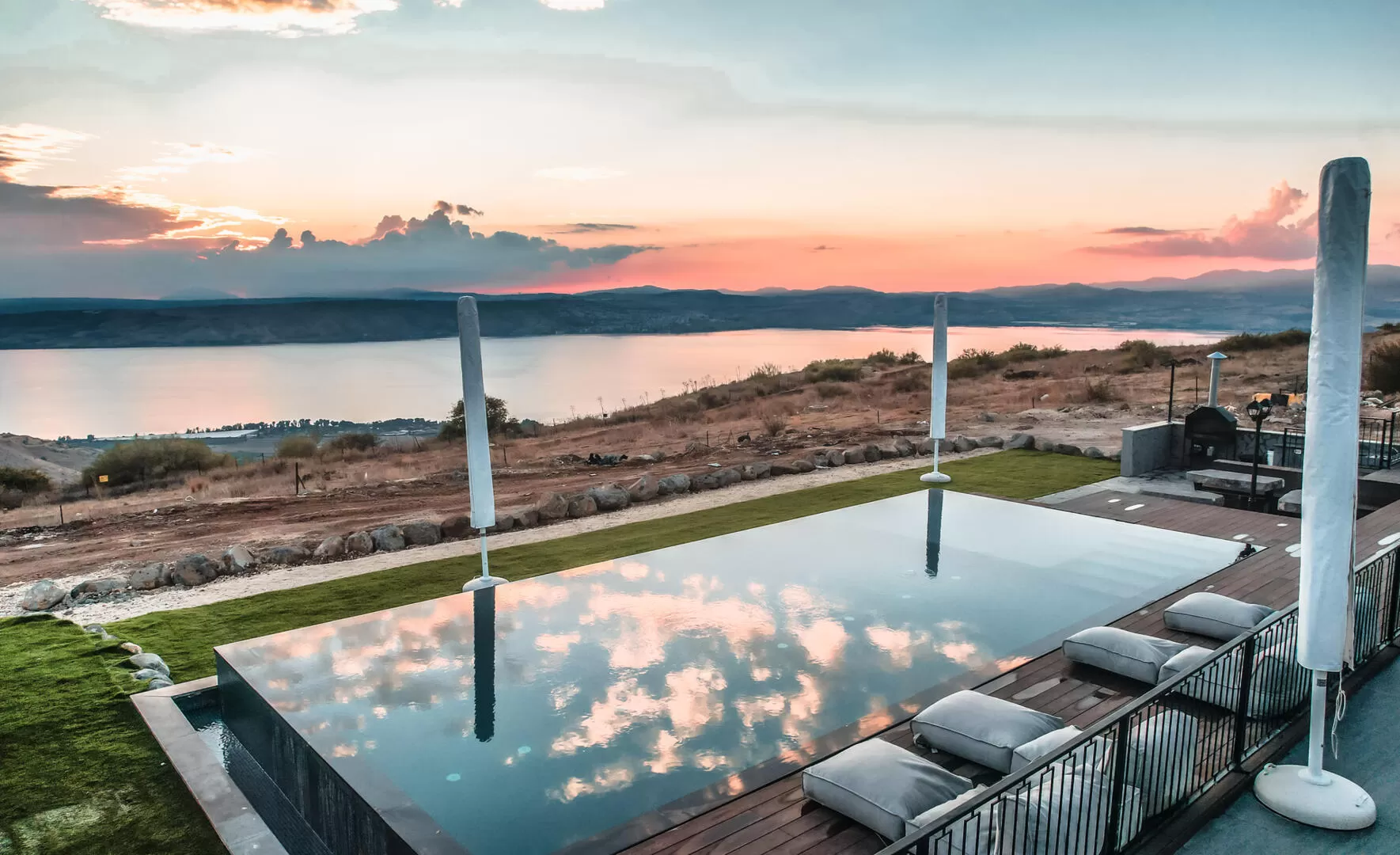 מתחם החוץ של הווילה מגיע הישר מעולם החלומות: המרחב כולו גדול מאוד, עם בריכת אינפיניטי מחוממת ומהממת ביופיה, שגולשת אל הנוף ומייצרת השתקפויות של מים, שמיים ואבני בזלת שאפשר למצוא רק ברמת הגולן. יש כאן מגוון אזורי ישיבה, ביניהם מיטות שיזוף "פופיות" לרביצה, פינת ישיבה בעבודת יד של עץ ואבן, שולחנות אוכל וכסאות - ובקיצור, כל מה שצריך כדי שתרגישו נוח, ובדיוק כמונו, תרצו רק להישאר כאן ולבהות אל הנוף.